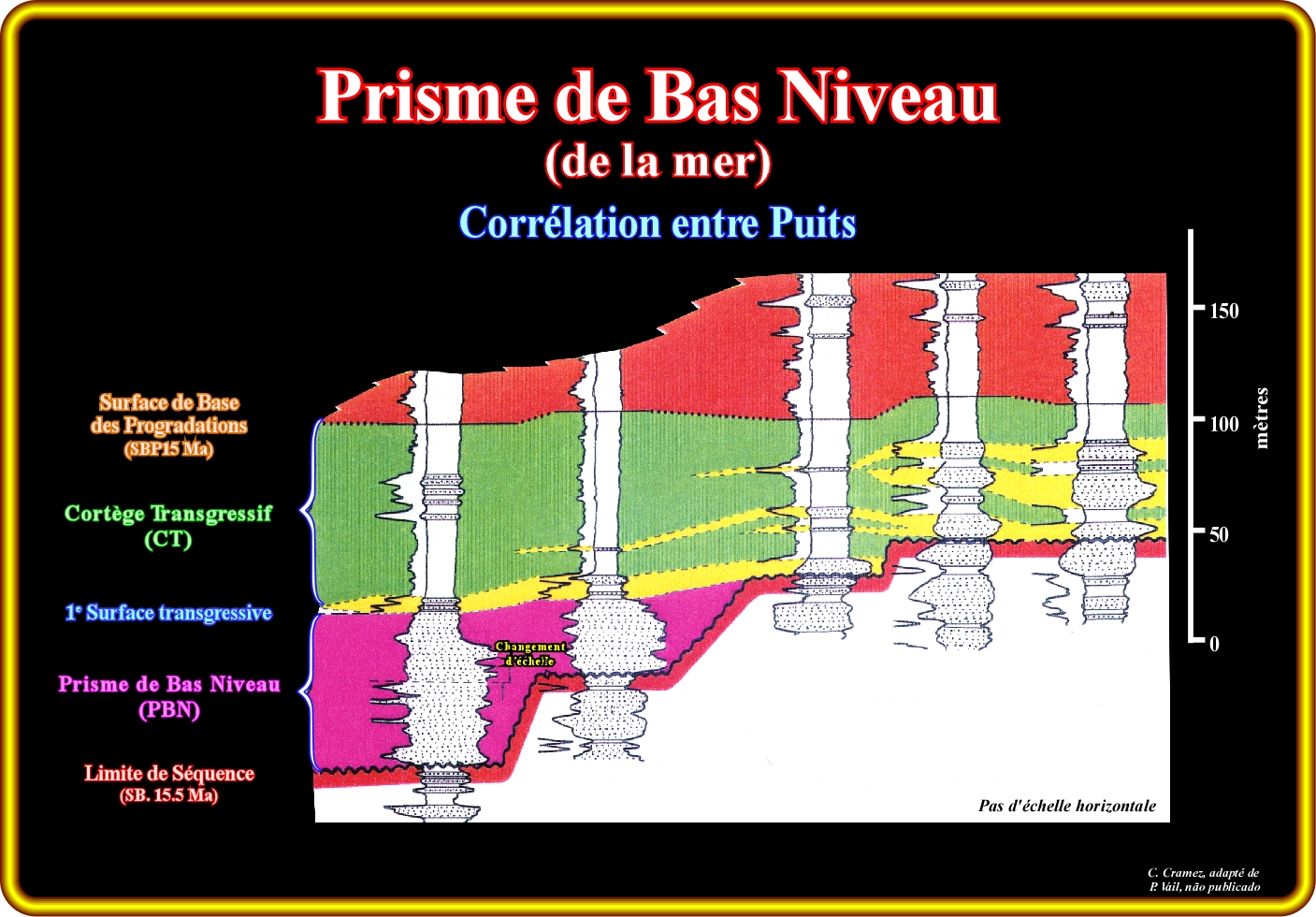 Dans un cycle stratigraphique dit cycle-séquence, entre la discordance inférieure (surface d'érosion) et la discordance supérieure (surface d'érosion), la différence d'âge est inférieure à 3 - 5 My. Trois grands cortèges sédiments peuvent être reconnu dans un cycle-séquence : (i) Cortège de bas niveau (CBN), au cours duquel le niveau de la mer est toujours plus bas que le dernier rebord du bassin (du cycle-séquence précédent), qui est composé trois membres, qui sont du bas vers le haut : (a) Cônes sous-marins de bassin (CSB) ; (b) Cônes sous marins de talus (CST) et (c) Prisme de bas niveau (PBN) qui, comme son nom l'indique, a une géométrie progradante prépondérante ; (ii) Cortège transgressif (CT) et (iii) Prisme de haut niveau (PBN). Le cortège transgressif et le prisme de haut niveau se déposent dans des conditions géologiques de haut niveau (de la mer), ce que veut dire que le niveau de la mer est au-dessus du nouveau rebord du bassin, lequel a passé a être la dernière rupture de l'inclinaison de la plaine côtière du prisme de bas niveau (rebord continental), dès que le niveau de la mer l'a inondé. Le cortège transgressif a une géométrie, globalement, rétrogradante, tandis que la géométrie du prisme de haut niveau est progradante. Cette figure illustre la corrélation stratigraphique (en cortèges sédimentaires qui forment les cycles-séquence), proposée par P. Vail, entre 5 puits d'exploration de l'onshore du Venezuela (lac Maracaibo). La discordance SB. 15.5 Ma, qui limite, inférieurement, le cycle-séquence SB. 15.5 - SB. 13.8 Ma, est facilement reconnaissable dans tous les puits d'exploration. Deux de ces puits, les plus distaux, ont pénétré le prisme de bas niveau (PNB ) en aval du rebord du bassin du cycle-séquence précédent. En amont du rebord du bassin du cycle-séquence précédent, la discordance basale (SB. 15.5 Ma) a été couverte directement par le cortège transgressif (CT), cela signifie, qu'en amont du rebord du bassin du cycle précédent, le prisme de bas niveau (PBN) ne s'est pas déposé. Ceci est très important, une fois qu'en en termes d'exploration pétrolière, on peut dire qu'à montant du nouveau rebord du bassin, les meilleures roches-réservoirs du bassin n'existent pas.