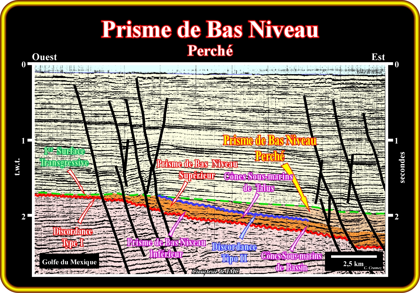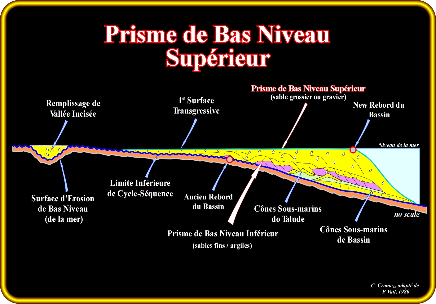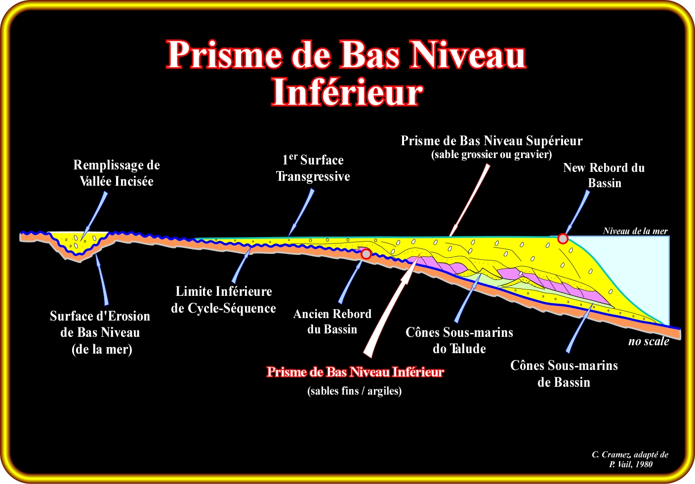 Dans un contexte géologique de rampe, le prisme de bas niveau (PNB) est composé de trois ensembles sédimentaires : (i) Vallées incisées remplies (Vir) ; (ii) Prisme bas niveau inférieur (PBNi) et (iii) Prisme de vas niveau supérieur (PBNs). Le prisme de bas niveau inférieur (PBNi), ainsi que les cônes sous-marins de bassin et talus, est déposée immédiatement après la chute relative du niveau de la mer et est fossilisé par le prisme de bas niveau supérieur (PBNs), qui est déposé lors de la montée relative du niveau de la mer..