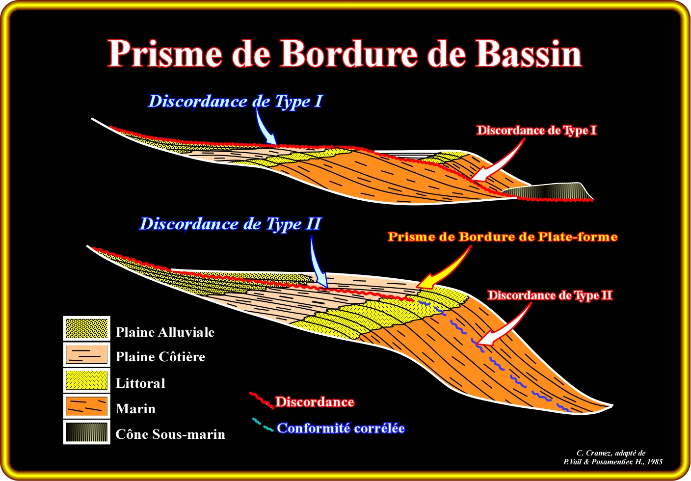 Les prismes de bordure des bassins (PBB) sont associés avec des discordances de type II. Initialement, les géoscientistes d'Exxon ont considéré deux types de discordances : (i) Discordances de type I et (ii) Discordances de type II. Une discordance de type I est induite par une chute relative du niveau de la mer qui met le niveau relatif de la mer plus bas que le rebord du bassin du cycle-séquence précédent. Ce rebord est, généralement, le bord externe de la plaine côtière, une fois que, dans la plupart des cas, au cours de la dernière partie du prisme de haut niveau (du cycle-séquence précédent), le bassin n'a pas de plate-forme. Une telle chute relative du niveau de la mer, exhume, complètement, la plate-forme continentale, si elle existe, ou soulève, encore plus, la plaine côtière par rapport au nouveau niveau relatif de la mer, et exhume, également, le talus continentale supérieur. Comme le montre le schéma supérieur, une telle descente, implique : (a) Un déplacement vers la mer et vers le bas des dépôts côtiers ; (b) La rupture des profils d'équilibre provisoire des cours d'eau ; (c) Le dépôt de cônes sous-marins profonds ; (d) Une surface d'érosion. Une discordance de type II est induite par une chute relative du niveau de la mer de petite amplitude. Le niveau relatif de la mer ne chute pas pas suffisamment pour que les conditions géologiques passent de haut vers bas niveau. Les dépôts côtiers sont légèrement déplacées vers l'aval et vers le bas (graphique du bas). Cela signifie que la plate-forme, si elle existe, n'est pas, entièrement, exhumée. Dans le cas où le bassin n'a pas de plat-forme, la plaine côtière n'est pas très soulevée par rapport au nouveau niveau relatif de la mer. En outre, comme la surface d'érosion est très limitée il n'y a pas de déposition turbiditique. La déposition continue, pratiquement, comme pendant le prisme de haut niveau, une fois qu'une montée ou stabilisation relative se produit après légère baisse. Cependant, le centre de déposition de ce nouveau intervalle sédimentaire, que certains géoscientistes appellent prisme de bordure du bassin (PBB) est, légèrement décalée vers l'aval par rapport au prisme de haut niveau au quel il est associé. Le dépôt se poursuit jusqu'à ce qu'une chute relative significative du niveau le la mer se produise. Actuellement, la plupart des géoscientistes pense que la différence entre ces deux types de discordances n'est pas relevant.