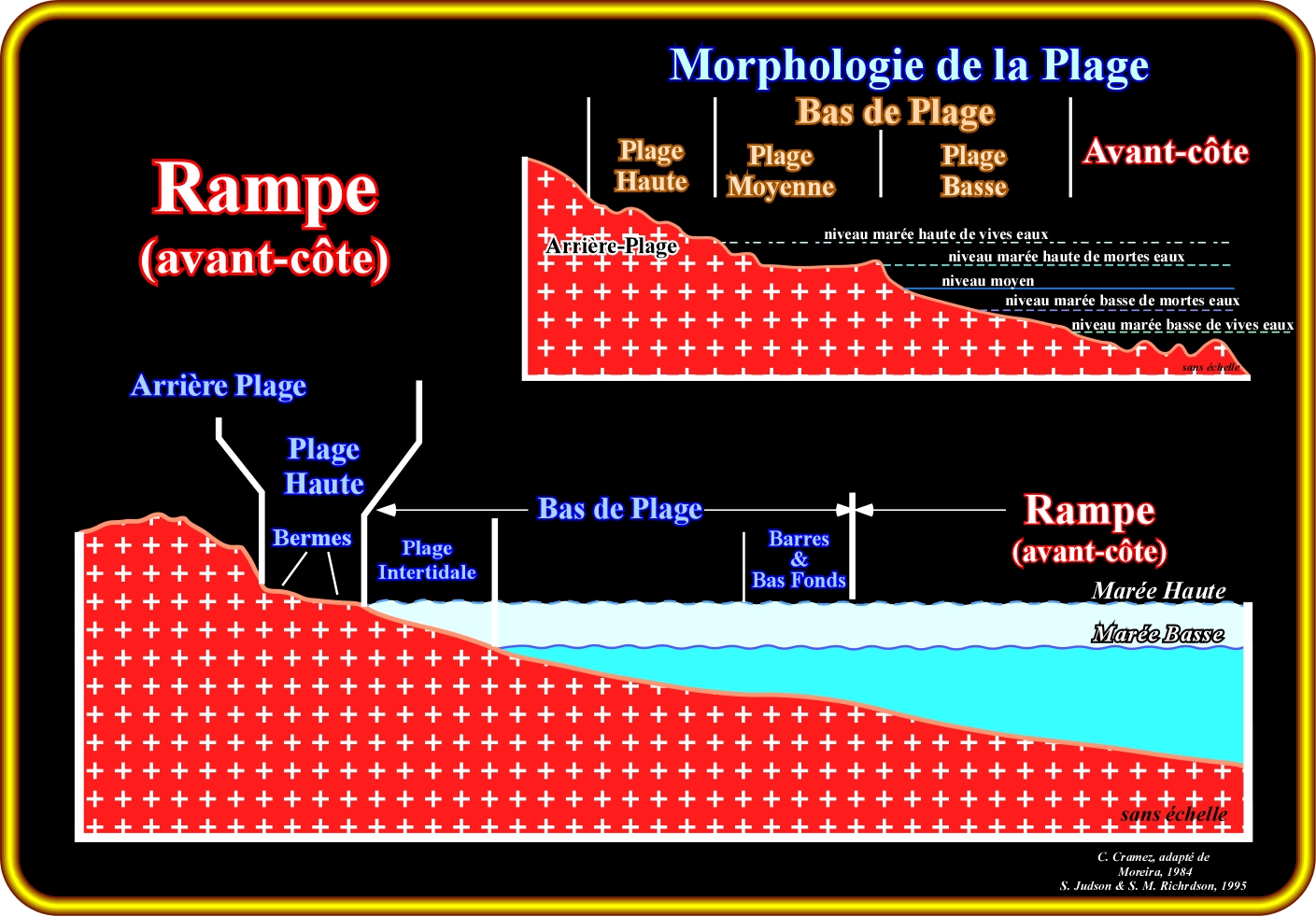 S. Judson et S. M. Richardson (1995) considère la rampe comme la surface du fond de la mer en aval de la limite distale du bas de plage. Cependant, pour eux, la plage englobe la zone intertidale, que la plupart les géoscientistes européens appellent la plage moyenne. En fait, la plupart des auteurs européens considèrent que tenant en ligne de compte les marées et ses effets, la morphologie de la plage (sensu lato) peut être divisée en cinq bandes : (i) Arrière Plage qui est la région en amont du relief qui marque la limite intérieure de la plage, lequel peut être une falaise ou un cordon littoral et qui peut isoler ou non, une lagune intérieure (c'est dans cette bande qui, généralement, sont construites des habitations) ; ( ii) Plage haute qui correspond à la partie supérieure de la plage ; il est seulement atteint par les vagues dans les marées hautes de vives eaux et de tempête ; la plage haute peut avoir des dunes dû à la présence de touffes de végétation ; la zone atteinte par les vagues est modélisée en marches, appelées gradins de plage, qui sont formés par un palier ou berme de plage et un talus ; (iii) Plage Moyenne, est la zone affectée par les courants de ressac, entre les niveaux de marée haute et marée basse de mortes eaux ; elle est séparée de la plage haute par le gradin plus bas de la plage et du bas de plage par la ligne d'inflexion ; la ligne d'inflexion entre la berme de la plage et le talus de chaque gradin est la crête de la berme ; toutes ces formes se modifient selon la marée et l'hauteur des vagues ; (iv) Bas de Plage qui correspond à la partie inférieure de l'estran (espace qui s'étend entre les limites atteintes par la marée basse, de vives et mortes eaux) ; l'inclinaison du bas de plage est très faible, bien qu'elle soit supérieure à celle de la rampe (avant-côte) ; le bas de plage est constitué par du matériel, généralement, fin, mais par fois, il peut contenir du matériel plus grossier qui est transporté longitudinalement ; (v) Rampe ou avant-côte qui correspond à la bande de la plage qui est toujours couverte par de l'eau ; elle s'étend vers l'aval du niveau de marée basse de vives eaux jusqu'à une limite qui varie avec les auteurs ; l'avant-côte est considérée par de nombreux géoscientistes comme équivalente à la zone de déferlement (surf), une fois que le fond de la mer de l'avant-côte est modélisé par des crêtes et sillons pré-littoraux dont les amplitudes peuvent dépasser le mètre.