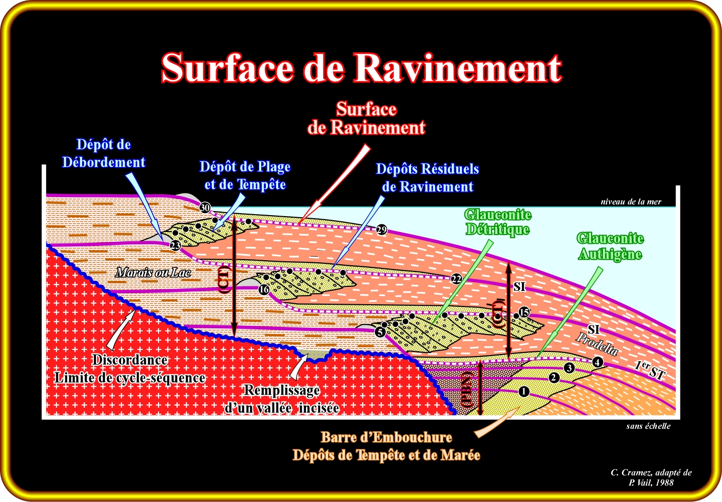 Les fleuves charrient vers la mer presque toute l'eau (et sédiments) qui tombe sur les continents. Ils s'écoulent, en général, selon la ligne de plus grande pente, un fois que leur écoulement obéit aux lois de la gravité. Quand en chaque point du profil longitudinal d'un fleuve, celui-ci a une inclinaison d'équilibre provisoire (le fleuve ni dépose ni creuse, de manière significative, son lit), on dit que le fleuve a atteint son profil d'équilibre provisoire. Dans ces conditions, l'inclinaison du fleuve, sur toute sa trajectoire, lui permet, uniquement, d'évacuer sa charge. Un tel profil n'est pas définitive, car le fleuve continue à transporter les sédiments qui sont érodées en amont. Cependant, on peut imaginer qu'à partir d'un certain moment, la pente du fleuve est telle qu'elle ne permet que l'écoulement de l'eau et que tout transport de sédiments a disparu. Dans ces conditions, le fleuve atteint ce qu'on peut appeler son profil d'équilibre définitif ou idéal. Lors d'une chute relative du niveau de la mer significative (subsidence plus tectonique), l'embouchure des fleuves est déplacée (parfois de centaines de kilomètres) vers l'aval, ce qui détruit complètement le profil d'équilibre (provisoire) des fleuves. Ainsi, ils sont, encore une fois, forcés de creuser leurs lits (régradation) formant des vallées incisées ou encaissées jusqu'à ce qu'un nouveau profil d'équilibre provisoire soit atteint. Dans cette ligne sismique, la dépression de la discordance A (anomalie négative), correspond à une vallée incisée que cours d'eau a creusé pour rétablir un nouveau profil d'équilibre provisoire, un fois qu'il avait été détruit par la chute relative du niveau de la mer responsable de surface érosion qui souligne la discordance (A). Plus tard, lorsque le niveau relatif de la mer a commencé à monter, se sont déposés, au-dessus des cônes sous-marins du bassin de cônes (déposé lors de la chute relative), en des conditions géologiques de bas niveau marin, les cônes sous-marins de talus et le prisme de bas niveau. Les vallées incisées sont remplies au cours de la partie terminale du prisme de bas niveau.