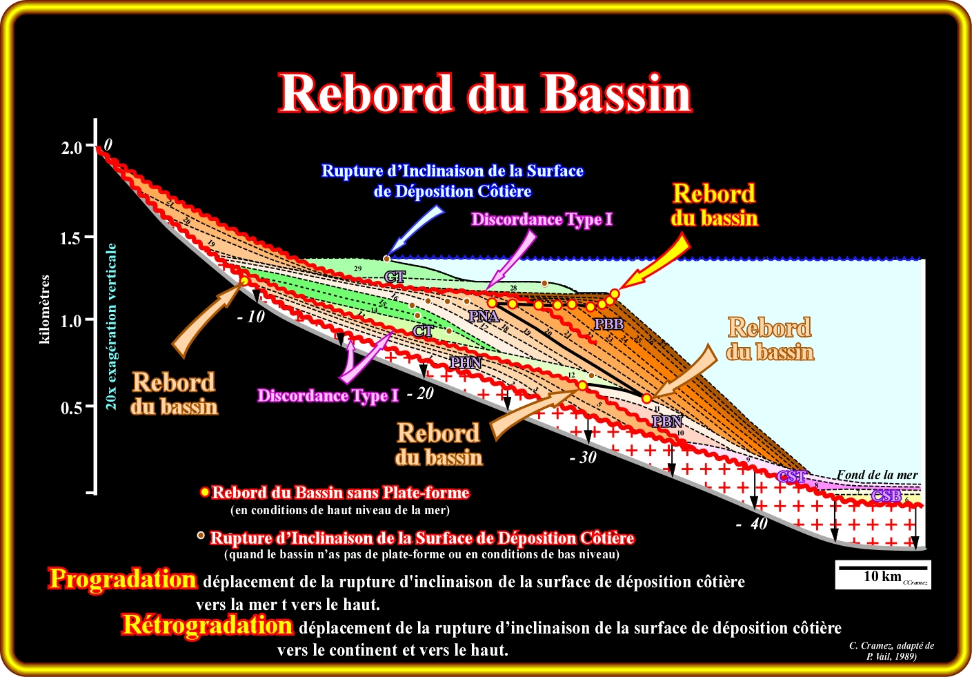 Dans un contexte géologique (bassin) en rampe, parler du rebord du bassin est vide de sens, car il y a une transition graduelle entre la ligne de côte et les environnements profonds. Dans le contexte géologique de faille de croissance, le rebord du bassin correspond, plus ou moins, à la position du plan de faille. Dans un contexte géologique de morphologique abrupte, comme illustré dans ce schéma, l'emplacement du rebord du bassin est variable, vu que le bassin, durant un cycle-séquence peut avoir ou non une plate-forme continentale. Comme illustré, pendant le prisme de bas niveau (1, 2, 3, 4 et 5) du cycle-séquence inférieur, le rebord du bassin correspond à la rupture d'inclinaison de la discordance inférieure (le bassin n'as pas de plate-forme). Dès que le niveau relatif de la mer a descendu et accentué encore plus les conditions géologiques de bas niveau marin, le rebord du bassin devient (5), c'est-à-dire, le rebord continental du cycle-séquence précédent. Au cours du dépôt du cortège de bas niveau du cycle-séquence complet, c'est-à-dire, au cours des cônes sous-marin de bassin (CSB - 6 et 7), cônes sous-mari de talus (CST - 8 et 9) et prisme de bas niveau (PBN -10 et 11), le rebord du bassin est toujours (5). Dès la première surface d'inondation, le rebord du bassin devient le bord continental du PBN (11). Pendant le cortège transgressive (CT), dont la géométrie est la rétrogradante, le rebord du bassin reste (11), une fois que la rupture d'inclinaison de la surface de déposition côtière se déplace vers le continent créant une plate-forme (12, 13, 14 et 15). Dès que le niveau relatif de la mer commence à augmenter, en décélération, le prisme de haut niveau (PHN) commence à se déposer en diminuant la surface de la plate-forme continentale (16, 17, 18 et 19). À partir du moment que le bassin n'a plus de plate-forme (19), le rebord du bassin change de (11) à (19). Au fur et à mesure de la progradation pendant le PHN et du prisme de bordure du bassin (PBB), le rebord du bassin passe successivement de 20 à 27, jusqu'à la nouvelle montée relative du niveau de la mer en accélération (CT).