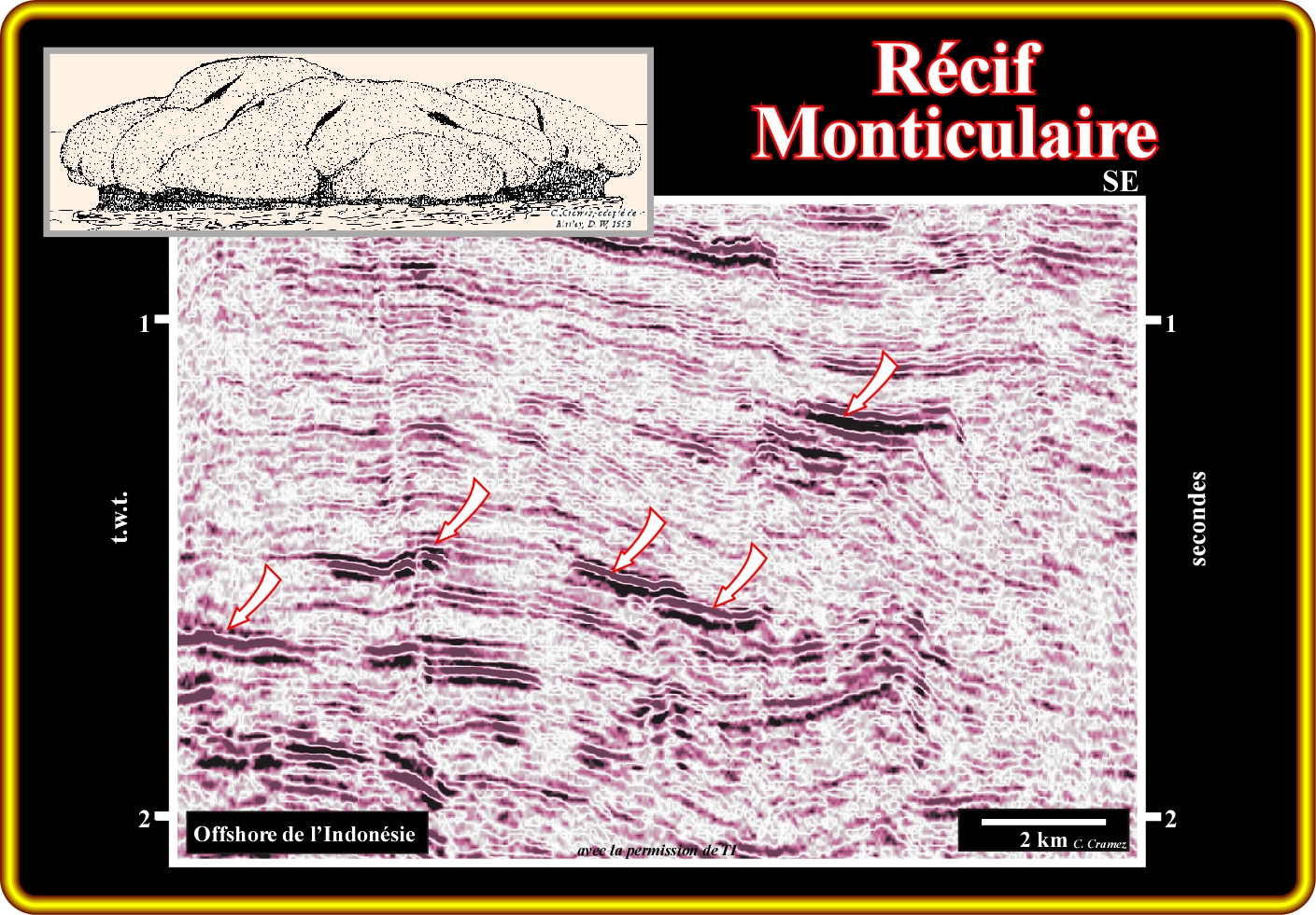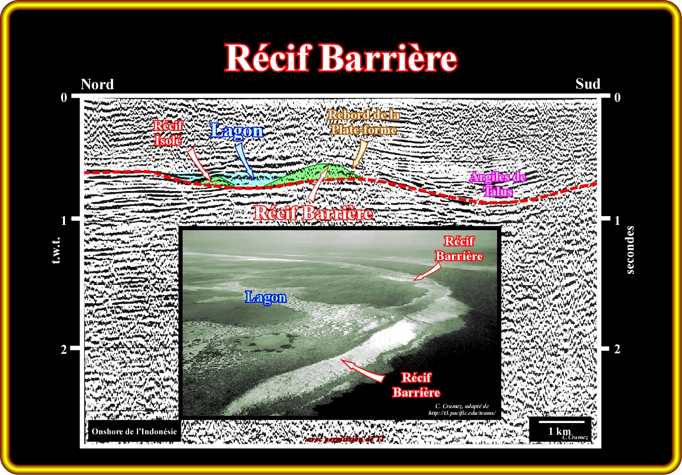 En géologie, un récif et les termes associés tels que bioherme, biostrome, monticule carbonaté, etc, sont définies en utilisant trois paramètres principaux : (i) Morphologie du dépôt ; (ii) Structure interne et (iii) Composition biotique. En réalité, il n'existe pas de consensus parmi les spécialistes des géosciences sur une définition universellement appliquée. Certaines définitions distinguent les récifs et les monticules de récifaux. Tous deux sont considérés comme des variétés de constructions organique-sédimentaires, construites par l'interaction entre les organismes et leurs environnements qui ont un caractère synoptique (permet de corroborer une conjecture scientifique) et dont la composition biotique diffère de celle trouvée dans et sous le fond marin. Les récifs sont soutenus par une structure squelettique macroscopique, dont l'exemple type sont les récifs coralliens. Les coraux et algues coralliens se développent les unes sur les autres pour former une structure tridimensionnelle qui est modifié de diverses manières par d'autres organismes et par des procédés inorganiques. En revanche, les monticules carbonatés sont construits par des microorganismes ou des organismes à partir desquels ne se développe aucune squelettique. Un monticule carbonaté microbien est construit, exclusivement ou principalement, par les cyanobactéries (procaryotes capables d'effectuer la photosynthèse, qui existent depuis environ 3.9 Gy). D'excellents exemples de biostromes formés par des cyanobactéries sont connus, aujourd'hui, dans le Grand Lac Salé de l'Utah (USA), Shark Bay, en Australie occidentale, etc. Sur cette ligne sismique de l'offshore de l'Indonésie (SO Kalimantan, Bornéo), est relativement facile à reconnaître des récifs. En fait, au moins deux anomalies sédimentaires carbonatées sont évidentes. L'une, la supérieure, est à environ 1.0 sec (t.w.t.) de profondeur, dans partie gauche de la ligne, et l'autre à une profondeur d' environ 2.5 secondes sur le côté droit de la ligne. Probablement, ces récifs délimitent plate-formes carbonatées auréolées, c'est-à-dire qu'ils se sont développés au fur et à mesure que le niveau relative de la mer monté, individualisant une lagune de la mer ouverte. La lagune, ainsi que la ligne de côte, au cours du cortège transgressif (CT) sont, relativement, bien visibles, bien qu'ils aient été fossilisés par les sédiments régressive du prisme de haut niveau (PNA), lesquels ont commencé à être déposer dès que le niveau relatif mer a commencé à monter en décélération.