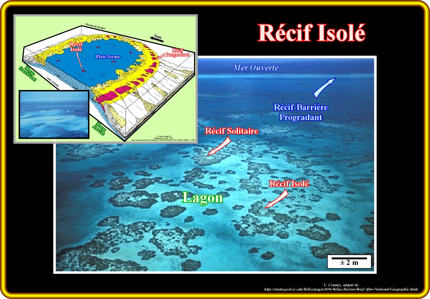 Dans cette planche, des petits récifs solitaires ou isolés, dans le lagon d'une plate-forme carbonatée isolée (non relié à la terre ferme), sont facilement reconnaissables. Le récif- barrière qui s'est développée sur la marge au vent de la plate-forme (côté du récif qui reçoit le vent) est visible dans la partie supérieure de la photographie (horizon blanc). Ce type de plate-forme carbonatée (plate-forme isolée), dont la largeur peut atteindre 100 kilomètres, se caractérise par le fait que les faciès sont très contrôlés par la direction des vents dominants. Ainsi, dans le sens du vent, se forment des récifs progradants et corps sableux, tandis que dans le côté sous le vent (bord de la marge opposé au côté d'où le vent souffle), les sédiments sont plus boueux. Dans les eaux calmes du lagon des récifs isolés sont très fréquents, dont beaucoup, à marée basse, ont le sommet au-dessus du niveau de a mer. Outre ce type de plate-forme carbonatée, il y a d'autres types où se peuvent développer des les récifs solitaires : (i) Plates-formes auréolées qui sont caractérisées par la présence de récifs coralliens ou de hauts fonds récifaux sur le rebord de la plate-forme et des sables argileux et récifs solitaires dans le lagon ; elles se forment dans eaux calmes et leur largeur peut varier entre 10 et 100 kilomètres, ; (ii) Rampes carbonatées, qui peuvent atteindre 100 km de large et où les récifs ne sont pas très fréquentes ; les sables carbonatés de la ligne de côte passent, dans la base de la rampe, à des les sables argileux et boue d'eau profonde ; les récifs ne sont pas très fréquents ; (iii) Plates-formes Épéiriques, dont la largeur peut atteindre 10.000 kilomètres et qui sont caractérisées par la présence de plaines de marée et de lagons protégés par des récifs solitaires et (iv) Plates-formes mortes ou noyées, qui se situent en dessous de la zone photique.