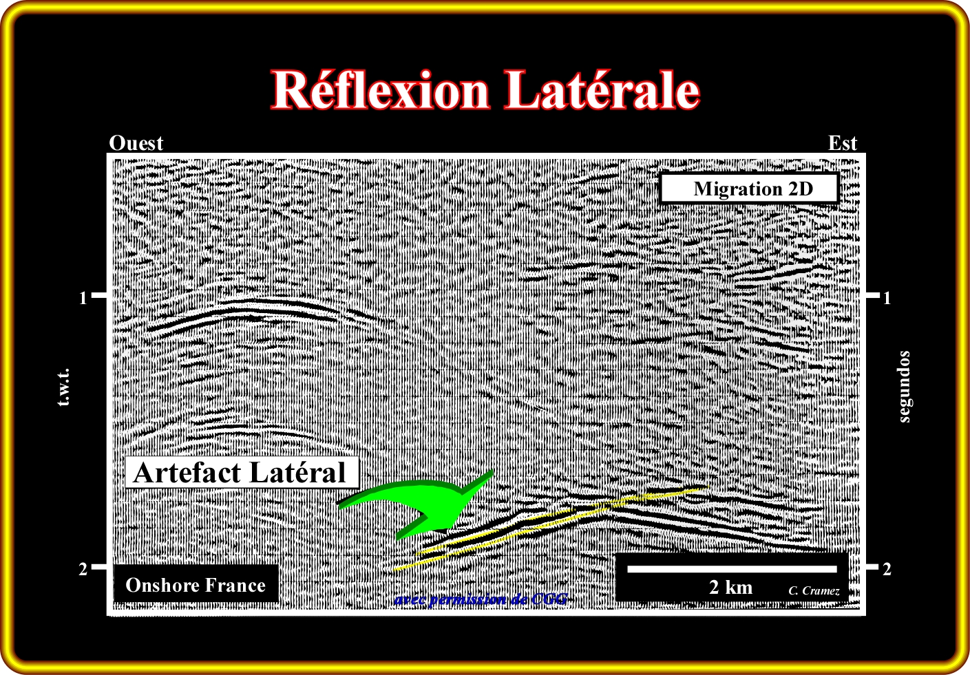 Chaque système de réflexions peut montrer des zones de continuité et de secteurs où elles se chevauchent. Sans autre évidence, nous ne pouvons pas dire quelles sont les réflexions continues qui sont associés à d'autres, ni dire, de quelle direction elles viennent. Parfois, l'examen d'autres lignes sismiques, mieux orientées par rapport à la structure des roches qui se forment terrain, peut permettre une interprétation géologique de lignes complexes avec des réflexions latérales provenant de diverses directions. Dans cette ligne de sismique terrestre (France), le réflecteur soulignée par la flèche a d'abord été interprété comme une réflexion induite plan de faille inverse. En fait, parfois, mais rarement, les plans de failles sont soulignées par une réflexion sismique : (i) Lorsque la zone de faille (zone entre les deux blocs de faille) est injectée sel, ce qui est très commun dans les bassins avec intervalles d'évaporites importants (onshore et offshore de l'Angola, bassin Lusitanien, etc.) ; (ii) Lorsque la zone de faille est injectée par du volcanisme, comme dans certaines zones de la mer du Nord et (iii) Lorsque le plan de faille sépare des blocs faillées avec des impédances acoustiques très contrastées, comme lorsque la faille est définie entre un socle (haute impédance) et un intervalle argilo-gréseux (faible impédance). L'interprétation de la réflexion illustrée dans cette ligne sismique comme induite par un plan de faille inverse est compatible avec le contexte géologique de raccourcissement de la région où la ligne a été tirée. Cependant, il est difficile d'imaginer, le long du plan de faille un contraste d'impédance si localisé entre les blocs de faille. Comme toute interprétation doit être soumise à un test de falsification (réfutation), la conjecture d'une réflexion induite par un plan de faille a été réfutée par une ligne sismique arbitraire 3D passant la ligne originale. En réalité, la réflexion est latérale, ce qui signifie qu'elle n'a pas de signification géologique, ce qui n'est pas le cas pour les autres réflecteurs, qui soulignent des lignes chronostratigraphiques.