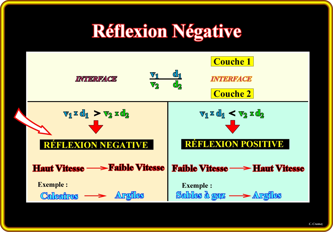 Une réflexion sismique est induite par un contraste d'impédance acoustique. L'impédance acoustique d'un intervalle donné est le produit de la vitesse des ondes sismiques au travers l'intervalle, par la densité des roches qui le forment. Une réflexion positive se produit lorsque l'impédance acoustique de l'intervalle supérieure est plus grande que celle de l'intervalle inférieur. Une interface entre un intervalle argileux et un intervalle carbonaté ou entre intervalle sableux et un intervalle carbonaté crée une réflexion négative. Dans le cas d'une interface entre sable et argile, la réflexion peut être positive ou négative. Tout dépend de la profondeur. Dans la partie supérieure d'un bassin sédimentaire, où les sédiments argileux ne sont pas suffisamment compactées, l'impédance acoustique d'une argile est plus petite que celle d'un intervalle sableux et la réflexion sismique associée est positive. Cependant, dans les parties profondes du bassin, les sédiments argileux sont beaucoup plus compactés que les sables, une fois qu'elles perdent presque la totalité de leur porosité initiale. Ainsi, en-dessous d'une profondeur, que certains géoscientistes appellent - point ou profondeur d'inversion - ,qui varie d'un bassin à l'autre, une interface sable-argile créée une réflexion négative. Dans la convention SEG, c'est-à-dire, dans la Convention de la Société Européenne de Géophysique, sur une ligne sismique, un réflexion positive est représentée par une déflexion vers la droite de la ligne de base de la trace sismique. Elle est colorée en noir (polarité positive). Au contraire, lorsque l'impédance acoustique est supérieure dans l'intervalle supérieur, la réflexion sismique associée est négative (par exemple, dans une interface calcaire-argile). Une réflexion négative est représentée par une déviation de la trace sismique vers la gauche et l'espace entre la trace et la ligne de base est colorée en blanc. Le long d'une ligne chronostratigraphique, surtout quand elle est déformée (par exemple, un anticlinal), une réflexion positive peut se transformer dans une réflexion négative ou vice versa. Imaginons dans l'apex d'un anticlinal, peu profond, un intervalle de sable à gaz entre deux intervalles d'argile. La réflexion négative induite par l'interface sable-schiste change vers positive dans la région où le sable est saturé par du gaz (la présence de gaz dans in intervalle sableux diminue l'impédance acoustique de l'intervalle de manière significative).