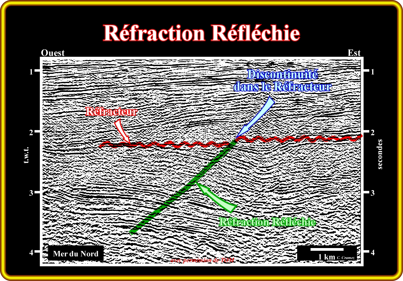 Dans certains bassins, comme dans le bassin cratonique de la Mer du Nord, afin d'éviter des erreurs d'interprétation des plans de faille, il est de première importance reconnaître et différencier les réfractions réfléchies des réflexions associées aux plans de faille. Dans la plupart des cas, il n'y a pas de réflecteurs sismiques associés aux plans de faille, sauf quand : (i) Ils sont injectées des roches de haute impédance, comme le sel, matériel volcanique, etc. ; (ii) Ils mettent en juxtaposition des formation géologiques avec des impédances acoustiques très différent. D'autre part, quand il y a des réflexions associées aux plans de faille, elles s'aplatissent en profondeur, ce que signifie que l'inclinaison des réflexions diminue en profondeur. Les réfraction réfléchies sont rectilignes (en temps et en profondeur). L'inclinaison d'une réfraction réfléchie dépend, uniquement, de la vitesse des ondes sismiques le long du réfracteur sismique. Cependant, toute anomalie le long du réfracteur (comme le déplacement vertical d'une interface) peut être un point de retour des ondes sismiques vers les géophones, c'est-à-dire, d'une réflexion rectiligne sans signification chronostratigraphique. Dans cette ligne sismique (détail d'une ligne régionale de la Mer du Nord), une réfraction réfléchie (rectiligne en profondeur), induite par le déplacement vertical du réfracteur (discordance) causée par une faille normale est facilement reconnaissable. Dans la version non-migrée de cette ligne sismique, la réfraction réfléchie est tangente aux hyperboles de diffraction créées par la faille. Ainsi, elle ne peut pas exister dans la partie arrière des d'hyperboles, une fois que dans la partie frontale des hyperboles, le réfracteur n'est pas à la même profondeur. Ceci explique pourquoi sur cette ligne qui est migrée, toutes les autres réfractions reflétées (non visible sur ce détail) inclinent toujours vers l'ouest. Si actuellement, la plupart des géoscientistes savent que les plans de faille des failles normales ou inverses s'aplatissent en profondeur, car la vitesse d'intervalle augmente en profondeur, dans les années 80-90, il était fréquent de voir des interprètes utiliser des règle roulantes pour pointer les plans de faille. N'oublions pas que seulement les plans de faille des failles de décrochement peuvent être verticaux.