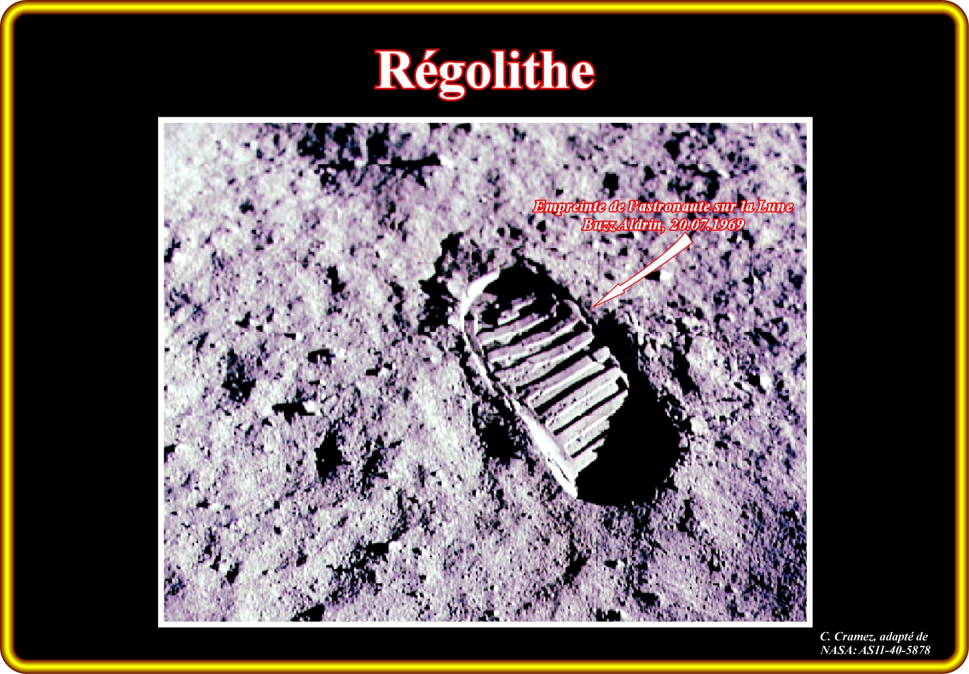 Toute couche sédimentaire non consolidée à la surface d'une planète, c'est-à-dire, tout matériel qui couvre, parfois, la roche solide est un régolithe. Comme sur la Terre, le sol est un régolithe. Le régolithe lunaire illustré dans cette photographie, prise au cours de la campagne Apollo, est, aussi, parfois appelée sol. Sur cette question, certains géoscientistes considèrent que, sur Terre, le régolithe, selon les cas, peut avoir plusieurs composants : (i) Sol ou Pédolithe ; (ii) Alluvium et Couverture Transportée y compris les transportés par des processus éoliens, glaciaires, marins et gravitaires ; (iii) Saprolithe qui correspond à la roche altérée chimiquement et qui n'est pas transportée, (le saprolithe peut, à son tour, être divisé en: a) saprolithe supérieur qui est complètement oxydé ; b) saprolithe inférieur qui correspondant à la roche altérée par réduction chimique et c) saprolithe fracturé qui correspond au substratum rocheux altéré uniquement autour des fractures) ; (iv) Cendres et laves volcaniques ; (v) Croûte endurée qui est formée par la cimentation du sol, saprolithe et matériel transporté comme des argiles, silicates, oxydes de fer et oxyhydroxydes, carbonates, sulfates et produits moins courants, en horizons résistants à altération météorique et à l'érosion ; (vi) Eaux Souterraine et Sels Minéraux et enfin (vii) Biota et Composants Organiques Dérivés. L'épaisseur du régolithe varie de zéro (lorsque le régolithe est absent) à des centaines de mètres. La formation de régolithe peut être presque instantanée (en termes géologiques), comme le régolithe produit par le dépôt de cendres volcaniques lors d'une éruption ou peut durer des centaines de millions d'années (régolithes du Précambrien sont connus dans certaines parties de l'Australie). Le régolithe est formé, principalement, par l'altération météorique ou par des processus biologiques. Beaucoup de gisements minéraux sont hébergés dans le régolithe, comme les sables minéraux, calcrètes (nodules de carbonates pédogénétiques) uranium, dépôts latéritiques, etc. Lorsque le régolithe contient un pourcentage important de composants organiques, il est, généralement, appelé sol. A la surface terrestre, la présence de régolithe est l'une des conditions les plus importantes pour le développement de la vie. Peu de plantes peuvent pousser directement sur ou dans le substratum rocheux. D'autre part, sans le régolithe la bioperforation est impossible et beaucoup d'animaux disparaissaient par manque d'abri pour se protéger des prédateurs.