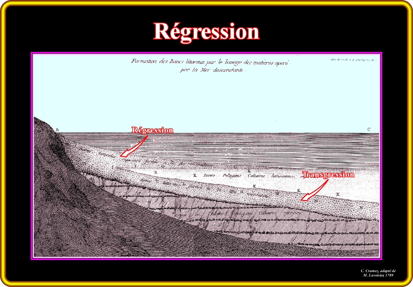 Lavoisier a été l'un des premiers scientifiques à comprendre le mécanisme des transgressions et régressions. Dans le bassin sédimentaire de Paris qui en réalité n'est pas un bassin sédimentaire, mais plutôt une plate-forme déformée, Lavoisier a lié les déplacements de la ligne de côte et des dépôts côtiers associés avec les variations relatives du niveau de la mer. Il a interprété le déplacement vers la mer des dépôts côtiers (régression) comme la conséquence d'une chute du niveau de la mer (ce qui n'est pas toujours vrai) et le déplacement vers montant (régression) comme la conséquence d'une montée du niveau de la mer. Aujourd'hui, il est bien connu qu'un épisode régressif (à l'intérieur d'un cycle-séquence, par exemple) est associé à une montée relative du niveau de la mer en décélération, tandis qu'un épisode transgressif est associé à une montée relative du niveau de la mer en accélération. En effet, pour avoir dépôt (cônes sous-marins exclus) il doit y avoir une augmentation de l'accommodation (espace disponible pour les sédiments). Dans la courbe cyclique de s variations relatives du niveau de la mer, laquelle est construite par l'action conjointe de la tectonique (subsidence ou soulèvement) et de l'eustasie, une transgression (déplacement vers le continent de la ligne de côte et des dépôts côtiers) se distingue d'une régression car dans le premier cas, la vitesse de montée de niveau relatif de la mer augmente alors qu'elle diminue dans la régression. Cependant, il est nécessaire de tenir en ligne de compte l'apport terrigène. Si l'apport terrigène est faible, la ligne de côte et les dépôts côtiers se déplacent vers le continent (transgression), quel que soit le taux de montée du niveau relatif de la mer (voire nul, cela signifie que le niveau relatif de la mer est stable). Inversement, si l'apport sédimentaire est trop grand, les dépôts littoraux et la ligne de côte se déplaceront vers la mer (régression) quelle que soit la variation relative du niveau de la mer (même durant une montée relative). Dans l'embouchure d'un fleuve, quand il se forme un delta, il y a côte à côte, une régression (delta) et une transgression (douves latérales ou des fosses). Si l'apport sédimentaire équilibre les montées relatives du niveau de la mer, la ligne de côte et les dépôts côtiers ne progradent pas, mais ne rétrogradent non plus. La ligne de côte reste au même endroit qui est aggradé verticalement.