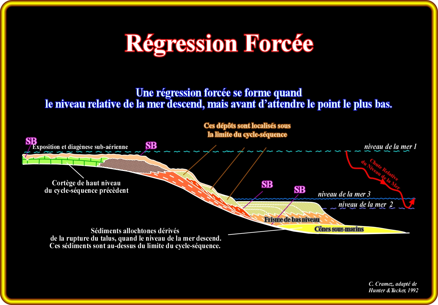 Dans un cycle stratigraphique dit cycle-séquence, Hunter et Tucker (1992) ont mis en évidence l'importance de l'architecture des dépôts côtiers (près de la ligne de côte) déposés durant une chute relative du niveau de la mer. Ce type de dépôts n'a pas été, initialement, pris en ligne de compte dans la stratigraphie séquentielle. Plus tard, ils ont été inclus dans un cortège sédimentaire propre, que certains géoscientistes ont appelé "biseau de systèmes de régression forcée". La reconnaissance d'un tel cortège soulève une question très importante : Où faut-il marquer la limite du cycle-séquence? En-dessous ou au-dessus de ces dépôts côtiers? Pour certains géoscientistes, comme Posamentier et Vail, la limite du cycle-séquence doit être placée en-dessous des dépôts de régression forcée, tandis que pour d'autres, comme Miall, la limite devrait être placé au-dessus. À propos de ce problème Miall (1977) dit que, théoriquement, la limite supérieure du cycle-séquence est facile à reconnaître dans les environnements non-marins, où elle est représentée par une discordance d'érosion. Cependant, même dans ce cas, il est difficile de la distinguer d'autres surfaces d'érosion, comme celles créées par l'incision autogénique d'un chenal. Comme dans un système régressif forcé le problème est de localiser la limite supérieur du cycle-séquence la séquence. Il a été suggéré qu'un telle limite représente le début de la chute relative du niveau de la mer. Certains géoscientistes ont proposé qu'elle devrait être placé en-dessous des dépôts formés pendant la phase de descente. Le problème d'une telle solution est qu'une telle limite qui peut être localement concordante, est tronquée par la surface régressive de l'érosion marine formée au cours de la phase de descente et ainsi associée au cycle sus-jacent qui est composée par une épaisseur importante des dépôts régressives du bas de plage formés pendant la phase de descente, ce qui signifie que la discordance subaérienne commence au début de la phase de descente, mais que l'érosion et incision se poursuivent jusqu'à la fin de la phase de descente du niveau de la mer.
