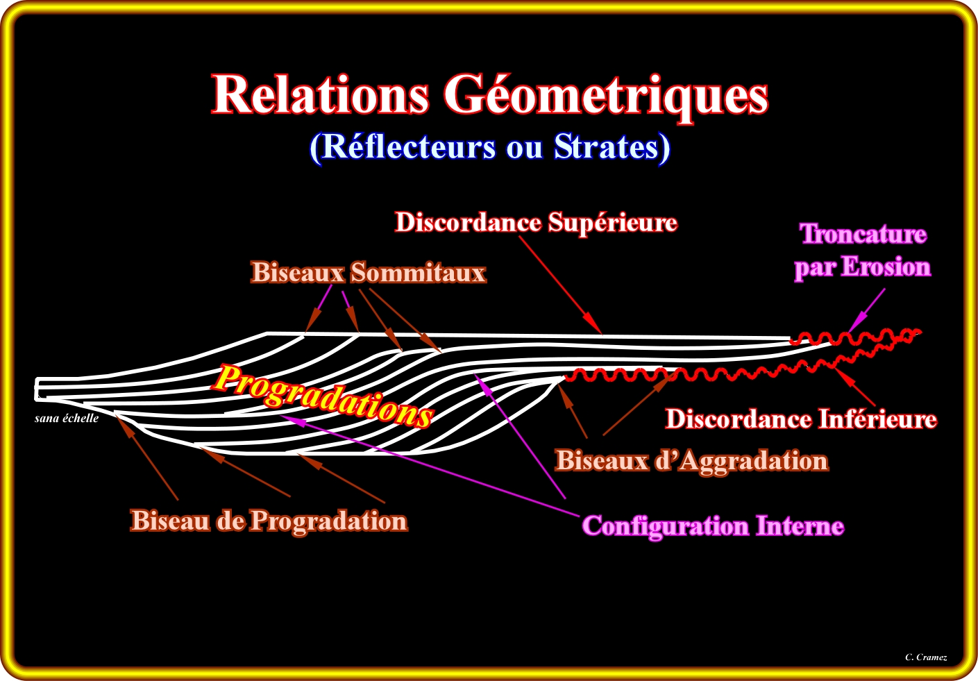 Dans ce schéma sont illustrés relations géométriques principales qui peuvent être trouvés dans un cycle stratigraphique dit cycle-séquence, soit sur une ligne sismique ou sur le terrain. N'oublions pas qu'un cycle-séquence est induit par un cycle eustatique de troisième ordre. Comme un cycle eustatique de 3ème ordre a une durée comprise entre 500 ky et 3-5 My, la différence d'âge entre les discordances ou les concordances corrélatives, qui limitent un cycle-séquence, ne peut pas être plus de 3-5 My (millions d'années). Les discordances qui, généralement, ne sont pas soulignées par une réflexion sismique, peuvent être mises en évidence par les surfaces sismiques définies par les terminaisons des réflecteurs sismiques (ou des couches). Comme illustré ci-dessus, il est important d'identifier : (i) Les biseaux d'aggradation qui expriment la relation géométrique entre les strates (ou réflecteurs sismiques), initialement horizontale, qui terminent sur une surface inclinée ou qui expriment la relation entre les couches initialement inclinées, qui se terminent contre une surface initialement plus inclinée ; différents types de biseaux d'aggradation peut être considérés : (i.a) Biseaux d’aggradation côtiers ; (i.b) Biseau d'aggradation distaux ; (i.c) Biseaux d'aggradation proximaux ; (i.d) Biseau d'aggradation marins, etc. ; (ii) Biseaux de progradation qui expriment la relation entre les strates ou les réflecteurs originalement inclinés, qui terminent, vers l'aval,, contre réflecteurs ou strates originalement horizontaux ou moins inclinés. Il existe plusieurs types de biseaux de progradation et (iii) Biseaux supérieurs ou sommitaux, qui expriment la relation entre les couches ou réflecteurs sismiques contre une surface sus-jacente ; les biseaux sommitaux, qui sont induites par non-dépôt ou par l'érosion peuvent être : (iii.a) Côtiers ; (iii.b) Marins et (iii.c) Non-marins.
