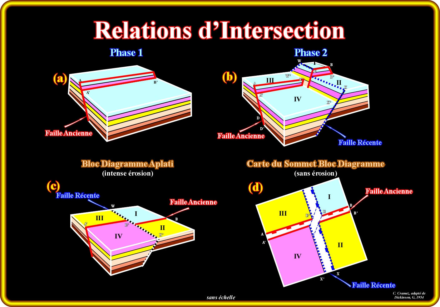 Une des erreurs les plus fréquentes des géoscientistes travaillant dans les compagnies pétrolières, c'est qu'ils oublient souvent la topographie quand ils déterminent l'âge relatif des failles par la méthode de relation d'intersection. La plupart des pièges forés par les compagnies pétrolières sont des pièges morphologiques par juxtaposition et non des pièges structuraux. Dans les pièges morphologiques par juxtaposition, la roche-réservoir est localisée dans un bloc faillé (généralement dans le bloc supérieur) est mise en juxtaposition avec une roche de couverture (latérale) du bloc faillé opposé en raison du mouvement relatif des deux blocs le long du plan de faille. L'âge du piège correspond à l'âge de la faille ou de sa réactivation. Un piège n'a d'intérêt que son âge est plus ancien que l'âge de la migration des hydrocarbures (on ne peut pas accumuler des hydrocarbures si le piège n'existe pas encore). Ainsi, la détermination de l'âge (relatif) d'un faille dont le mouvement a crée un piège est essentielle dans l'exploration pétrolière. Dans un schéma sans topographie (comme indiqué en C dans la figure ci-dessus), cela signifie dans une zone (carte géologique) avec une topographie plane, c'est la faille plus jeune (quelle soit normal ou inverse) qui déplace la plus ancienne. Dès qu'il y a une topographie relativement contrastée ce qui est le cas dans la plupart des cartes géologiques et sismiques en isochrones (lignes de temps) est la faille la plus récente qui est, apparemment, déplacée par la faille la plus ancienne (n'oublions pas qu'il n'y a pas de failles normales verticales). Dans l'exemple illustré ci-dessus, au cours de la phase 1 (Crétacé) il s'est formé une faille normale de direction N 45° (azimut), qui incline vers N 135°. Elle a produit un abaissement important du bloc inférieur. Au cours du Miocène (phase 2), un autre régime tectonique en extension a créé une faille normale direction N 310 °N inclinant dans la direction N 220°. Cette faille a produit, également, un affaissement important du bloc inférieur. Dans la carte de la surface du bloc diagramme (sans érosion, en D), apparemment , est la faille la plus récente qui est déplacée par la faille la plus ancienne, ce qui n'est pas le cas lorsque la topographie est plate (C).