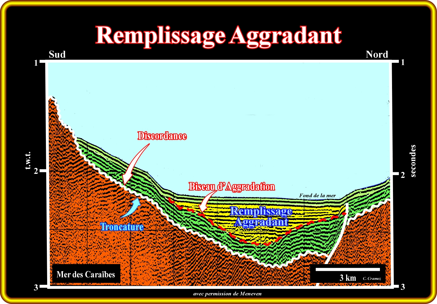 Dans cette tentative d'interprétation géologique d'une ligne sismique de la Mer des Caraïbes, sont illustrés deux discordances, c'est-à-dire, deux surfaces d'érosion induites par deux chutes relatives du niveau de la mer significatives qui ont mis le niveau de la mer plus bas que le rebord du bassin du cycle stratigraphique précédent. Ces deux discordances ont été renforcées par la tectonique. Elles ont été transformées en discordances angulaires, une fois que les terminaisons des réflecteurs sous-jacents aux discordances sont des biseaux sommitaux par troncature (érosion). L'intervalle sédimentaire, probablement d'eau profonde, qui est limité entre la discordance supérieure et le fond de la mer, a une configuration interne parallèle. Cela signifie que cet intervalle est caractérisé par des réflecteurs parallèles qui reposent sur la discordance (limite inférieure du cycle stratigraphique) par des biseaux d'aggradation marins, une fois que sur la ligne sismique perpendiculaire, les relation géométrique et terminaisons des réflecteurs sont les mêmes. Ainsi, on peut dire que la profondeur de l'eau de déposition diminue au fur et à que les sédiments, certainement, pélagiques se déposent. Comme on peut constater, l'intervalle sédimentaire sous-jacente, limité entre deux discordances, peut, éventuellement, être subdivisée en deux cycles. En fait, dans la partie nord de la ligne, dans le bloc inférieur de la faille normale qui semble contemporaine de la sédimentation, au moins deux biseaux d'aggradation permettent de mettre en évidence une autre surface d'érosion, c'est-à-dire, une autre discordance. Toutefois, pour des raisons de simplicité, elle n'a pas été pointée. De toute façon, la configuration interne de cet intervalle est plus ou moins parallèle, et les réflecteurs fossilisent la discordance, qui limite inférieurement le cycle stratigraphique (probablement un cycle-séquence) par des biseaux d'aggradation, qui soulignent un exhaussement côtier et certainement pas marin, ce qui implique une forte chute relative du niveau de la mer avant que cet intervalle sédimentaire se dépose.