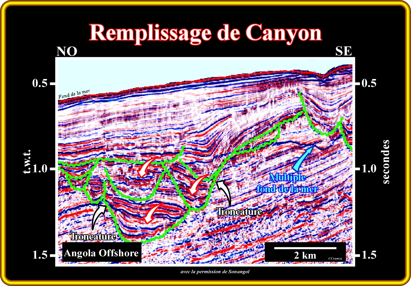 Avant tout il faut préciser que comme dans le cas d'un chenal et de son remplissage, la plupart des géoscientistes, probablement commodité, appel canyon, sur le terrain et sur les lignes sismiques, pas la vallée profonde entre les falaises rocheuses creusées par un cours d'eau, mais son remplissage. Pour éviter toute confusion, on doit utiliser la définition originale. Un canyon a un courant d'eau qui l'a originé. Le remplissage d'un canyon ou canon fossilisé est l'ensemble des roches qui remplissent et fossilisent un ancien canon. D'autre part, il ne faut pas oublier que la grande majorité des canyons sous-marins visibles sur les talus continentaux actuels ne sont pas associés à l'action érosive des fleuves ou des des courants de turbidité, mais l'érosion des courants ascendants induites par le vent (mouvement Eckman et l'effet Coriolis). Dans cette tentative d'interprétation géologique d'une ligne sismique de l'offshore nord de l'Angola, située sur le talus continental supérieure, près de l'embouchure du fleuve Congo, le remplissage de plusieurs canyons illustre la complexité non seulement de la genèse des canyons, mais aussi pour leurs remplissages. En effet, même si individuellement chaque étape de remplissage montre une configuration, plus ou moins, divergente avec biseaux d'aggradation, probablement, marins, collectivement la géométrie est complexe. Cette complexité suggère que l'ancêtre de l'actuel fleuve Congo, dont le canyon est, actuellement, plus ou moins, rectiligne, il a changé plusieurs fois de lit, en alternant sa position. Cela signifie que les périodes d'érosion et de remplissage alternent. Ces variations latérales du lit de l'ancêtre du Congo, qui ont, probablement, été induites par l'effet de pendule, sont les responsables de la distribution, plus ou moins aléatoire, des roches-réservoirs déposées au cours du Miocène supérieur.