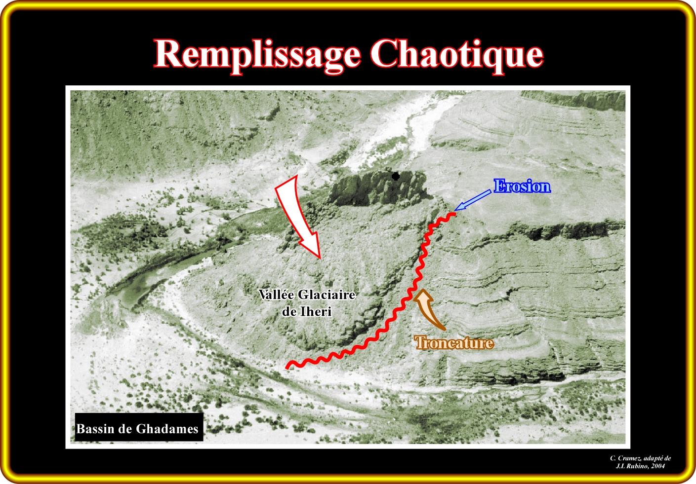 Sur cette photo, en tenant compte des relations géométriques externes (biseaux d'aggradation par troncature), on peut facilement reconnaître une remplissage d'une dépression. De même, la configuration interne du remplissage cette dépression peut être considérée comme chaotique, une fois qu'il n'y a, pratiquement, aucune continuité des plans de stratification. Il est important de noter que, dans ce cas particulier, l'érosion a été contrôlée par des événements glaciaires, probablement, induits par l'épaississement et progression d'un glacier. De toute façon, l'avancée d'un glacier le long de sa vallée correspond à une chute relative du niveau de la mer par glacio-eustasie. Plus tard, lorsque les glaciers ont fondu, le niveau relatif de la mer monte et les vallées glaciaires libérés de la glace sont inondés, avant même que le niveau de la mer inonde la plaine côtière. Cela signifie qu'au moins la partie distale des vallées glaciaires (près de la plaine fluvioglaciar) a été inondée, et largement remplie, en conditions géologiques de bas niveau marin (niveau de la mer plus bas que le rebord du bassin du cycle stratigraphique précédent). En d'autres termes, une grande partie du remplissage des vallées glaciaires a été fait pendant le dépôt du prisme de bas niveau niveau (partie supérieure). Il semble que ce remplissage précoce des vallées glaciaires a une configuration interne parallèle et qui, plus en amont, a, souvent, une configuration chaotique comme celle illustrée sur cette photo (remplissage de la vallée glaciaire d'Iheri). En termes géologiques régionaux, ce sont les sédiments de l'Ordovicien qui ont subi une érosion glaciaire intense, laquelle a formée une série de vallées glaciaires orientées, plus ou moins, Nord-Sud que, plus tard, au cours de la transgression du Silurien Inférieur, ont été remplies avant être complètement fossilisé par les sédiments du Silurien Supérieur. C'est dans ces remplissages précoces qu'on trouve les sédiments riches en matière organique ("Hot shales»), qui constituent les magnifiques roches-mères de la région.