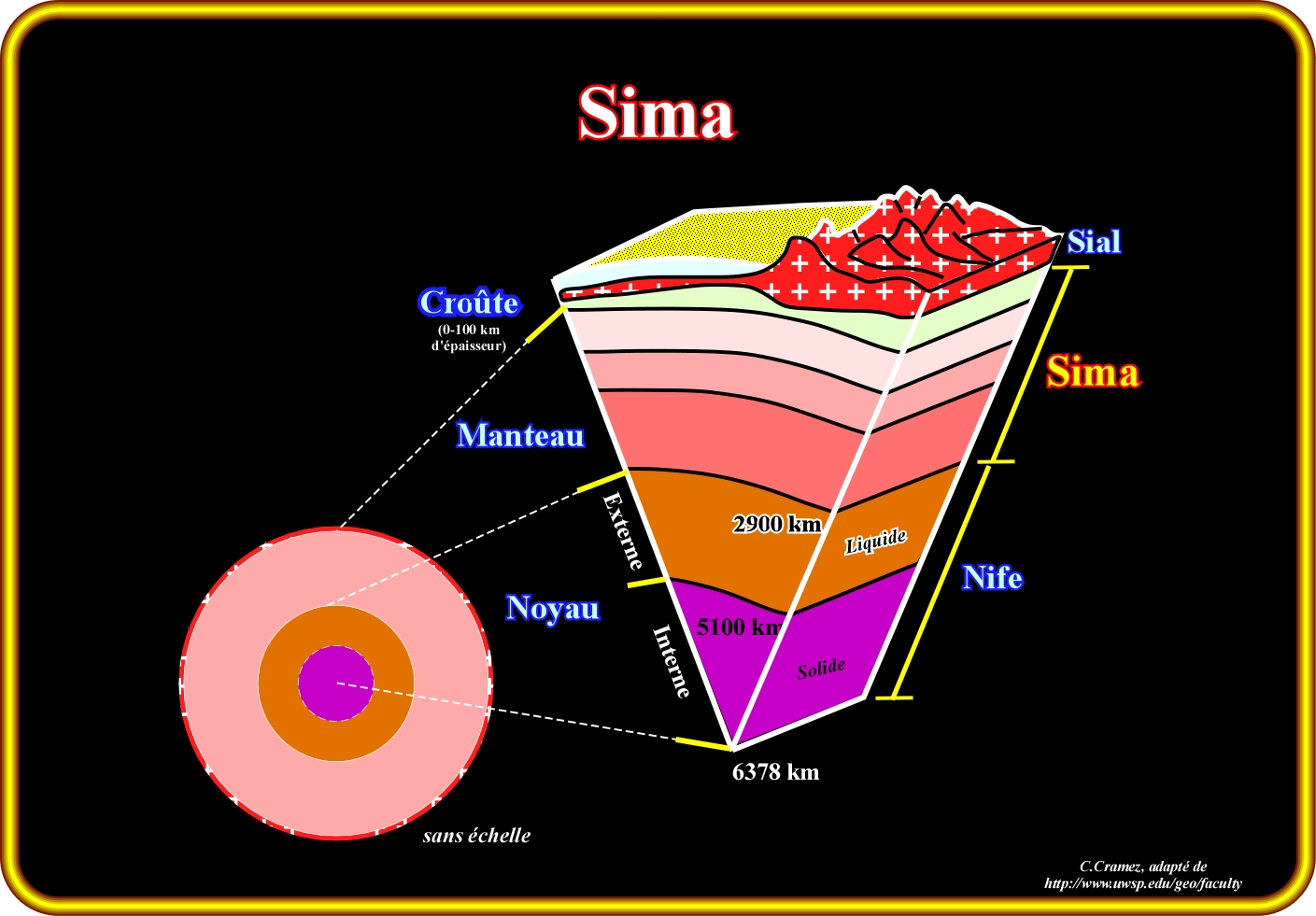 Le sima est le nom donné au niveau inférieur de la croûte terrestre, bien que, comme illustré au-dessus, il s'étende jusqu'à 2900 km de profondeur, autrement dit, jusqu'à la limite supérieure du noyau de la Terre qui s'appelle nife, une fois que le nickel et le fer sont ses composantes principaux. Le nom sima dérive des deux premières lettres de silicium et magnésium. Le sima est composé par des roches constituées par des minéraux riches en silicium et magnésium. Typiquement quand le sima affleure dans le fond de la mer, il est, principalement, formé par des basaltes, ce qui a amené beaucoup de géoscientistes à l'appeler niveau basaltique de la croûte terrestre. D'autre côté comme les fonds océaniques sont fondamentalement constituées par du sima, certains géoscientistes, de façon erronée, l'appellent croûte océanique, une fois que, comme dit ci-dessus, le sima s'étend jusqu'au noyau terrestre, autrement dit, beaucoup au-delà de la croûte océanique. La densité du sima est plus grande que celle du sial que lui est sus-jacent. La densité du sima varie entre 2800 et 3300 kg/m^3. Quand le sima affleure en surface, surtout au fond de la mer, il est formé par des roches mafiques ou par des roches riches en minéraux mafiques. Le sima plus dense tient moins de silicium et forme des roches appelées ultra-mafiques. Le sial a une densité entre 2700 et 2800 kg/m^3 qui est, largement, inférieur à la densité do sima (2800 - 3300 kg/m^3). A la base, le sial passe, progressivement, aux basaltes qui forment le sima. La ligne qui sépare le sial du sima est la discontinuité de Conrad qui, de manière arbitraire, est placée dès que la densité moyenne atteint 2800 kg/m^3. La densité moyenne du sima varie entre 2800 e 3300 kg/m^3, dans la partie supérieure et 3300 e 5600 kg/m^3 dans la partie moyenne inférieure. Ainsi, on peut dire qu'au point de vue de la composition chimique, la Terre se divise en trois couches : (i) Sial qui est la couche superficielle, peu dense, et composée, principalement par du silicium et aluminium ; (ii) Sima qui est la couche intermédiaire, avec une épaisseur d'environ 2 850 km, ductile, dense et composée, principalement, par du silicium et magnésium et (iii) Nife qui est la couche inférieure et, plus au moins, équivalente au noyau de la Terre.