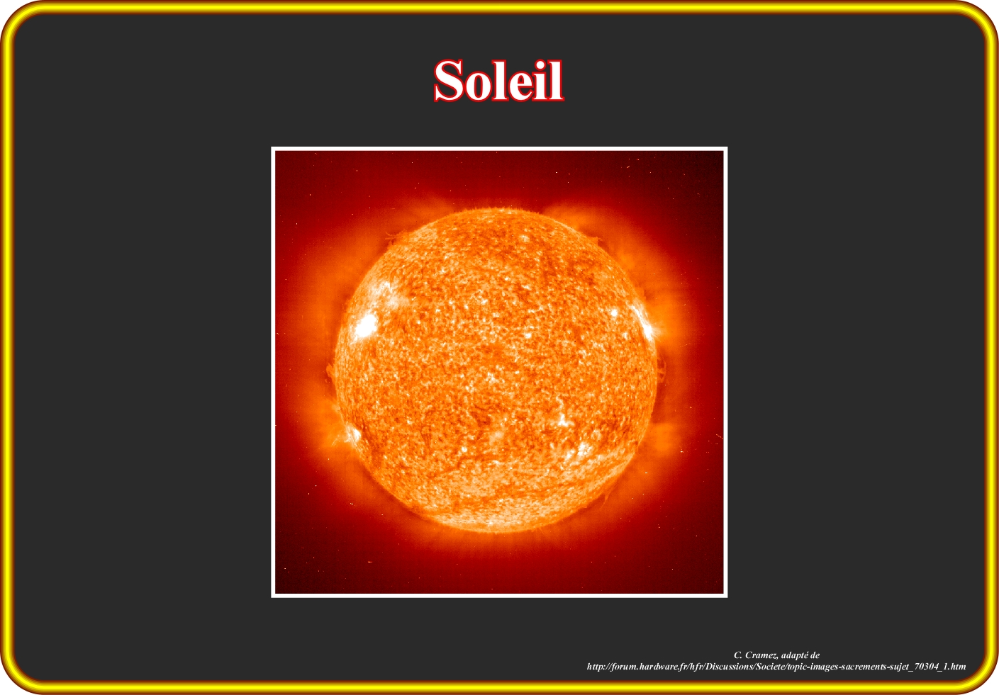 Étoile au centre du système solaire. Le soleil a un diamètre d'environ 1392000 kilomètres et sa masse est environ 99.86 % de la masse du système solaire.