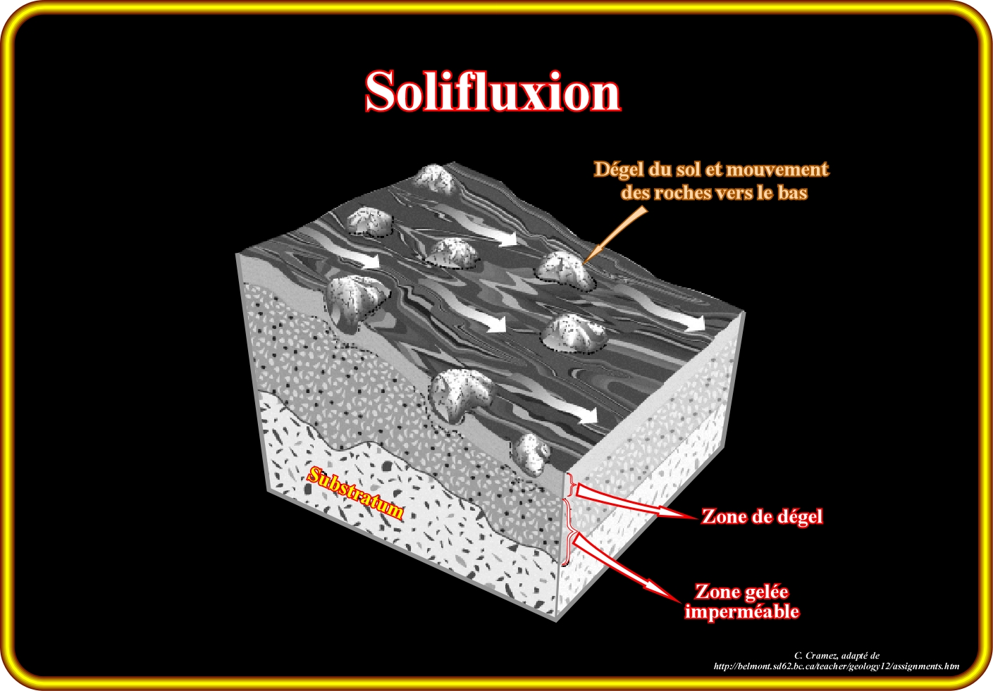 Écoulement, le long d'une pente, d'un sol saturé d'eau. Comme le permafrost est imperméable à l'eau, le sol sus-jacent peut devenir saturé et ainsi glisser vers le bas due à la force de gravité. Le mouvement vers le bas de la pente, lequel peut déformer ou détruire complètement les plans de stratification du sol a, généralement, une vitesse maximale de quelques centimètres par jour.