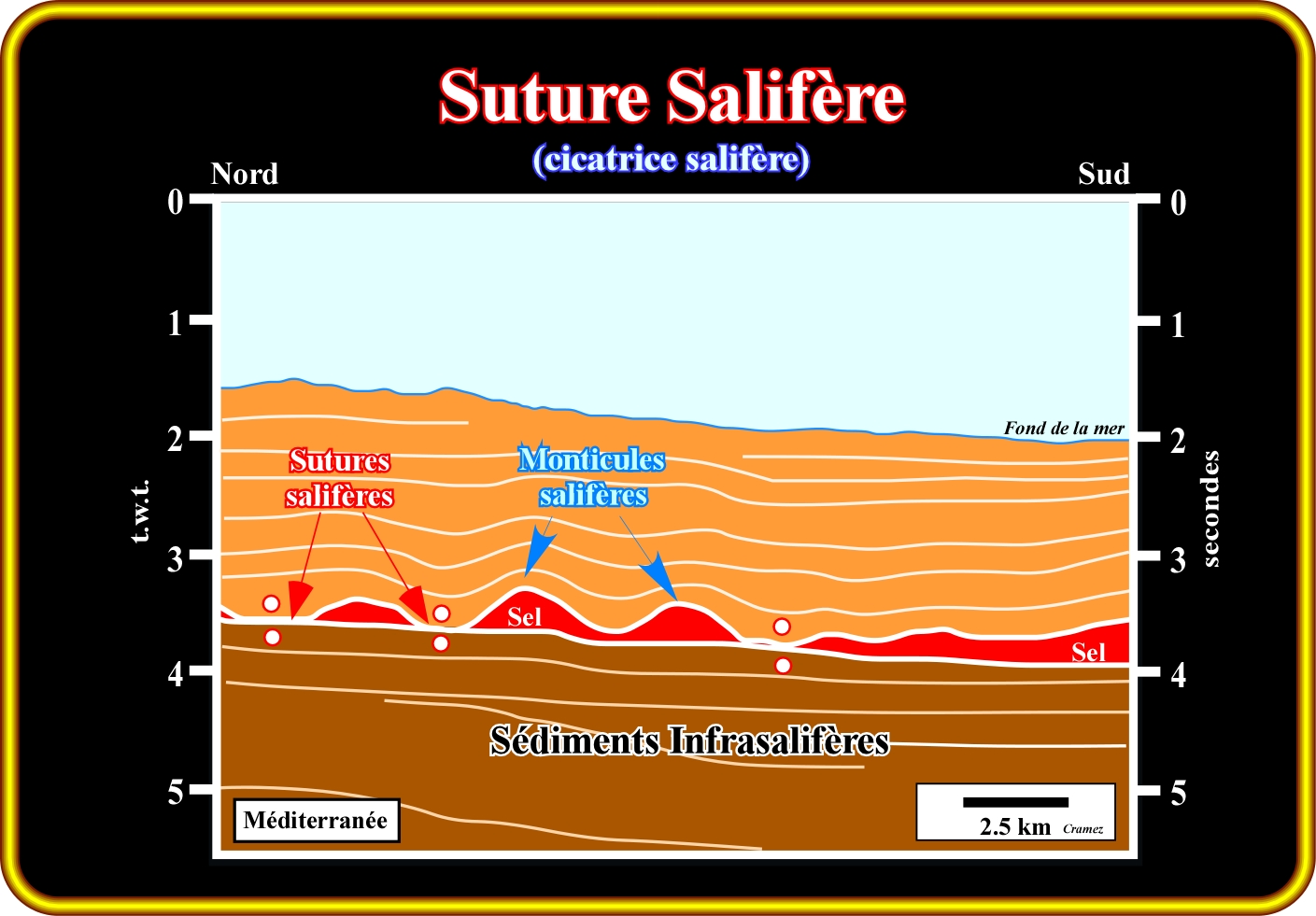 Une suture salifère peut constituer un résidu, bréchifié insoluble composé de pseudomorphes d'halite ou d'un intervalle de sel peu épais (épaisseur inférieure à la résolution sismique) pour être détecte sur les données sismiques ou à une absence totale de sel. En général, une suture salifère est, mais pas toujours soulignée par une disharmonie tectonique (ne pas confondre avec une discordance, laquelle implique une érosion significative). Une autre caractéristique des sutures salifères, comme illustré dans cette tentative d'interprétation géologique d'une ligne sismique de la Méditerranée, est la présence d'une inversion structurale dans les sédiments postérieurs au sel. Ceci veut dire que les monticules salifères ne sont pas des anticlinaux mais plutôt des antiformes. Ils correspondent à des structures en extension créées, en général, par un écoulement latéral de l'horizon salifère. Il y a trois types de sutures salifères : (i) Sutures primaires ; (ii) Sutures secondaires et (iii) Sutures tertiaires. Les sutures primaires unissent des strates originalement séparés par des évaporites autochtones. Ces sutures sont, légèrement, peu inclinées. Elles mettent en contact sédiments infra-salifères relativement peu inclinés et des sédiments supra-salifères qui, localement inclinent de forme plus accentuée, ce qui crée une disharmonie tectonique. L'inclinaison est, localement, renforcée par la rotation des sédiments, soit par des failles listriques ou par un subsidence compensatoire. Les sutures secondaires unissent des strates originalement séparées par des structures diapiriques (parois, murs de sel, etc.). Elles sont presque toujours verticales. Les sutures tertiaires unissent des intervalles sédimentaires originellement séparés par des structures salifères de 1 ère ordre ou supérieure (corniches, langues, manteaux, sills, etc.). Il est important de noter que la configuration interne des intervalles supra-salifères permet de déterminer si le déplacement latéral et vertical des évaporites est contemporain ou pas de la sédimentation. Dans cette tentative d'interprétation, la configuration divergente du premier intervalle post-salifère suggère un fluage du sel très précoce.