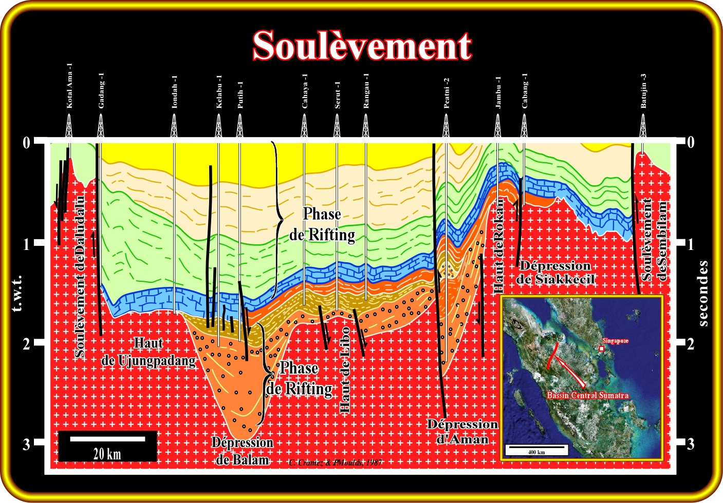 Dans cette tentative d'interprétation géologique d'une ligne sismique composite du Nord de l'île de Sumatra (Indonésie), il est évident, que les sédiments (bassin d'arrière-arc) ont été raccourcis par un régime tectonique compressif. Un tel régime tectonique est caractérisé par une ellipsoïde des contraintes effectives (pression géostatique + pression des pores + pression tectonique) dont l'axe principal (σ_1) est horizontal et l'axe le plus petit (σ_3) est vertical. Les structures responsables par le raccourcissement sont des plis cylindriques et failles normales, lesquelles, pour la plupart, correspondent à la réactivation d'anciennes failles normales qui ont élargit les sédiments pendant la phase d'extension (ou de rifting). Cependant, comme on peut le constater par l'épaisseur, plus au moins, constante (sans variations latérales abruptes) des sédiments de la phase cratonique (subsidence thermique en opposition à la subsidence de la phase de rifting), on peut dire, que le raccourcissement sédimentaire a été, pratiquement, postérieur à la déposition. Ceci veut dire, que le soulèvement associé à la compression n'a eu aucune influence dans la création d'espace disponible pour les sédiments déjà déposés. En effet, les variations relatives du niveau de la mer qui créent de l'espace disponible pour les sédiments, pendant la phase thermique du bassin d'arrière-arc du Nord de Sumatra, ont été, principalement, induites par l'action combinée de l'eustasie et tectonique (subsidence du bassin), autrement dit, par des enfouissements du fond de la mer. Cependant, comme la longueur d'onde (cyclicité) des variations eustatiques est très supérieure à celle des variations tectoniques, ce sont les premières qui sont prédominantes et qui déterminent la cyclicité des dépôts. Toute les fois que le niveau eustatique à descendu, il s'est formé une surface d'érosion (discordance) qui marque la fin d'un cycle stratigraphique et le début d'un autre. Quand le raccourcissement est contemporain de la sédimentation, l'épaisseur des intervalles sédimentaires diminue dans les régions où il y a soulèvement, une fois que la tranche d'eau diminue, autrement dit, que localement, l'espace disponible pour les sédiments diminue relativement aux autres régions.