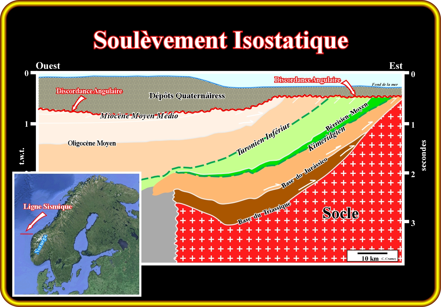 Dans cette tentative d'interprétation géologique d'une ligne sismique de l'offshore Ouest de la Norvège, le soulèvement isostatique induit par la décharge (fusion) des calottes glaciaires qui ont couvert le Nord de l'Europe et, particulièrement, la Norvège pendant le début du Quaternaire, est parfaitement, visible. Dans la partie supérieur de cette tentative d'interprétation, les terminaisons des réflecteurs soulignent une discordance renforcée par la tectonique (discordance angulaire) qui marque la chute relative du niveau de la mer qui a eu lieu pendant le Miocène Moyen et qui, localement, a été renforcée par la tectonique. Comme on peut le constater, la partie Est de cette discordance a été soulevée de plusieurs centaine de mètres par rapport à la partie Ouest. Ce soulèvement local qui est conformé par la variation de l'épaisseur des sédiments quaternaires postérieurs à la fusion de la glace, a été induit par le saut isostatique qui a accompagné la fusion de la glace des glaciations quaternaires. En fait, pendant la dernière période glaciaire, la plupart de l'Europe, Asie, Amérique du Nord, Groenland et Antarctique étaient couvertes par des calottes glaciaires. L'épaisseur de la glace a atteint environ 3000 mètres dans la maximum de la glaciation, il y a environ 20000 années en arrière. L'énorme poids de cette couche de glace a obligé la croûte à se déformer en synforme (structure en extension ou allongement), ce qui a obligé le matériel du manteau à s'écouler vers les zones non surchargées. Cependant, dès que la température a augmenté et que la glace a commencé à fondre, la rémotion de la surcharge des région enfouies a provoqué un soulèvement de la région et le retour du matériel du manteau terrestre vers sa position originelle, autrement dit, la position qu'elle avait avant la glaciation. Tenant compte de la viscosité du matériel du manteau, probablement, seront nécessaires beaucoup de milliers d'années pour que la surface terrestre atteigne l'équilibre isostatique. Notons, que pour qu'une épaisseur de glace d'environ 2000 mètres (comme celle qui existe aujourd'hui sur le Groenland) le terrain s'enfonce d'environ 700 mètres, une fois que la densité de la glace est environ 1/3 de la densité du manteau. Tout cela a un influence très importante dans les variations relatives du niveau de la mer, lequel, pendant les glaciations, a descendu pour après monter pendant les déglaciations.