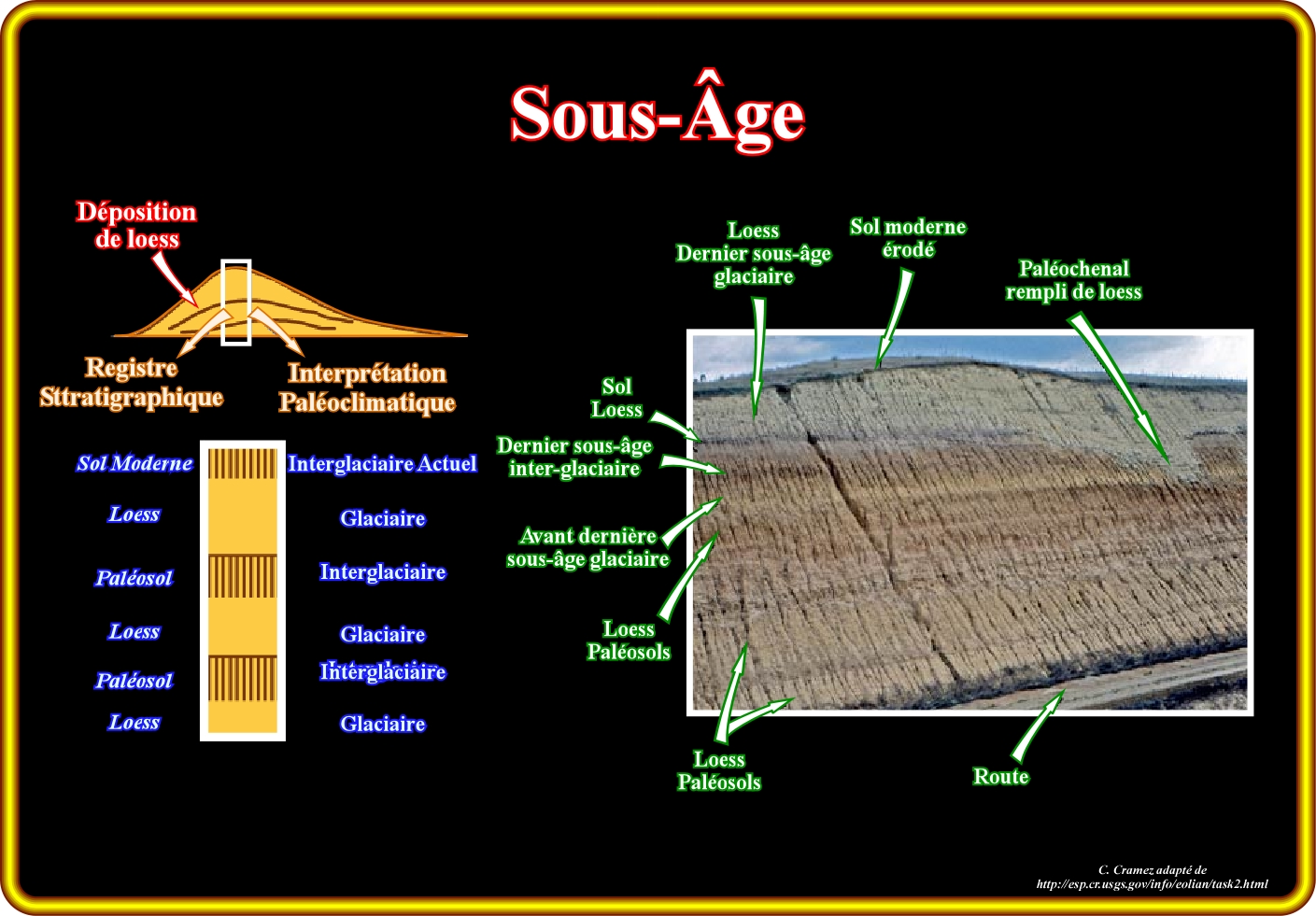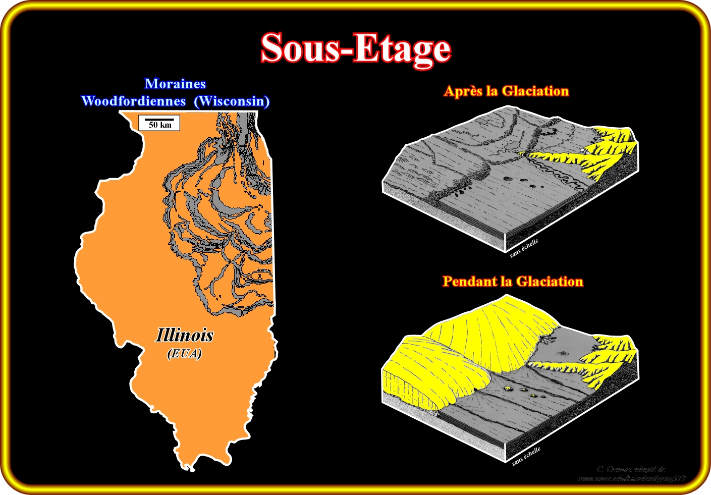 La plupart des géoscientistes divise les intervalles géologiques rocheux en : (a) Énothème ; (b) Erathème ; (c) Système ; (d) Série ; (e) Étage ; (f) Formation ; (g) Membre et (h) Horizon. Dans la chronostratigraphie standard (Hardenbol, J., et al., 1998) sont considérés, uniquement, quatre intervalles : (i) Érathème, comme, par exemple, le Mésozoïque ; (ii) Système, comme le Jurassique , (iii) Série, comme le Jurassique Inférieur ou Lias et (iv) Étage, comme, par exemple, le Toarcien, qui est l'étage supérieur du Lias. Les équivalents temps de Érathème, Système, Série et Étage sont respectivement, Ère, Période, Époque et Âge. Les sous-étages sont les divisions des étages. Les sous-étages sont, surtout, utilisés dans l'Époque Pléistocénique (entre 1.6 Ma et 10 ka). Pendant cette époque (Époque glaciaire), une grande partie du nord de l'Amérique et de l'Eurasie ont été, périodiquement, couvertes par des calottes glaciaires. L'épaississement (avance) des calottes glaciaires a alterné avec des périodes (milliers d'années) d'amincissement (recul) induites par le dégel. Plusieurs cycles glaciation / déglaciation, en particulier des calottes glaciaires ont eu lieu pendant le Pléistocénique. Ces cycles induits par les changements climatiques ont produit variations eustatiques significatives. Pendant les âges interglaciaires (subdivisions d'un époque géologique), le climat (en certaines parties du globe) était agréable et similaire au climat actuel. La succession des âges glaciaires peut être reconnue par les étages glaciaires, autrement dit, par les sédiments déposés par les glaciers (moraines ou tills). Les moraines frontales (étages et sous-étages) représentent les âges et sous-âges pendant lesquels les glaciers et les calottes glaciaires avaient un épaississement plus grand qu'aujourd'hui. Beaucoup des moraines et tills sont séparés les unes des autres par des sols et sédiments non-glaciaires, qui soulignent les âges et sous-âges interglaciaires. L'étude et la datation des moraines, comme illustré dans cette figure, a permit l'individualisation de quatre sous-étages (Mankato, Cary, Tazewel e Iowan) dans le Wisconsien (étage équivalent au Wurm dans l'Amérique du Nord).