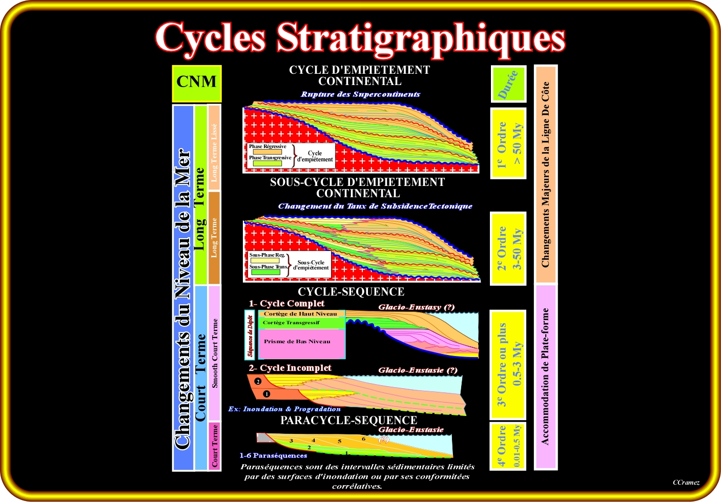 L'hiérarchie des cycles stratigraphiques proposée par Duval et al. (1993) considère quatre cycles stratigraphiques principaux : (i) Cycle d'Empiétement Continental ; (ii) Sous-Cycle d'Empiétement continental ; (iii) Cycle-Séquence et (iv) Paracycle-Séquence ou Cycle Paraséquence (actuellement, Paracycles du cycle-séquence). Ces cycles stratigraphiques sont associés respectivement à des cycles eustatiques de 1er, 2e, 3e et 4e ordre. Les ordres des cycles eustatiques sont déterminées par le temps de durée. Un cycle eustatique de 1er ordre a une durée supérieur a 50 My (millions d'années). Un cycle de 2e ordre dure entre 3 - 5 et 50 My. Un cycle de 3e ordre a une durée entre 3-5 My et 0.5 My, tandis que le temps de duré d'un cycle de 4e ordre varie entre 0.5 et 0.1 My. Notons qu'un paracycle (aussi appelé paraséquence par certains géoscientistes), comme son nom le suggère, n'est pas associé à un vrai cycle eustatique. La superposition de plusieurs paracycles (du cycle-séquence) correspond à des montées relatives du niveau de la mer sans qu'il ait entre elles de descente relative. Un ensemble de paracycles forme un cycle-séquence, qui est complet quand tous les cortèges sédimentaires sont présents : (a) Cônes sous-marins de bassin ; (b) Cônes sous-marins de talus ; (c) Prisme de bas niveau (de la mer) ; (d) Cortège transgressif et (e) Prisme de haut niveau (de la mer). Notons que cette classification est plus cohérente que celle proposée initialement par P. Vail, dans la mesure où les limites entre les cycles et sous-cycles correspondent toujours à des discordances, autrement dit, à des surfaces d'érosion. Dans le cas des paracycles (du cycle-séquence), les limites correspondent à des surfaces de ravinement qui se peuvent uniquement considérer comme des surfaces d'érosion mineures induites par des montées relatives du niveau de la mer. Comme illustré ci-dessus, les sous-cycles d'empiétement continental sont induits par des cycles eustatiques de 2e ordre, lesquels semblent être crées, principalement, par les variations du taux de subsidence tectonique. À l'intérieur d'un sous-cycle d'empiétement continental est presque toujours possible de mettre en évidence une surface de base des progradations, laquelle sépare une sous-phase transgressive, caractérisée par une géométrie rétrogradante, d'une sous-phase régressive (géométrie progradante). En association avec l'interface entre la sous-phase transgressive et régressive, peuvent se déposer des roches-mères potentielles.