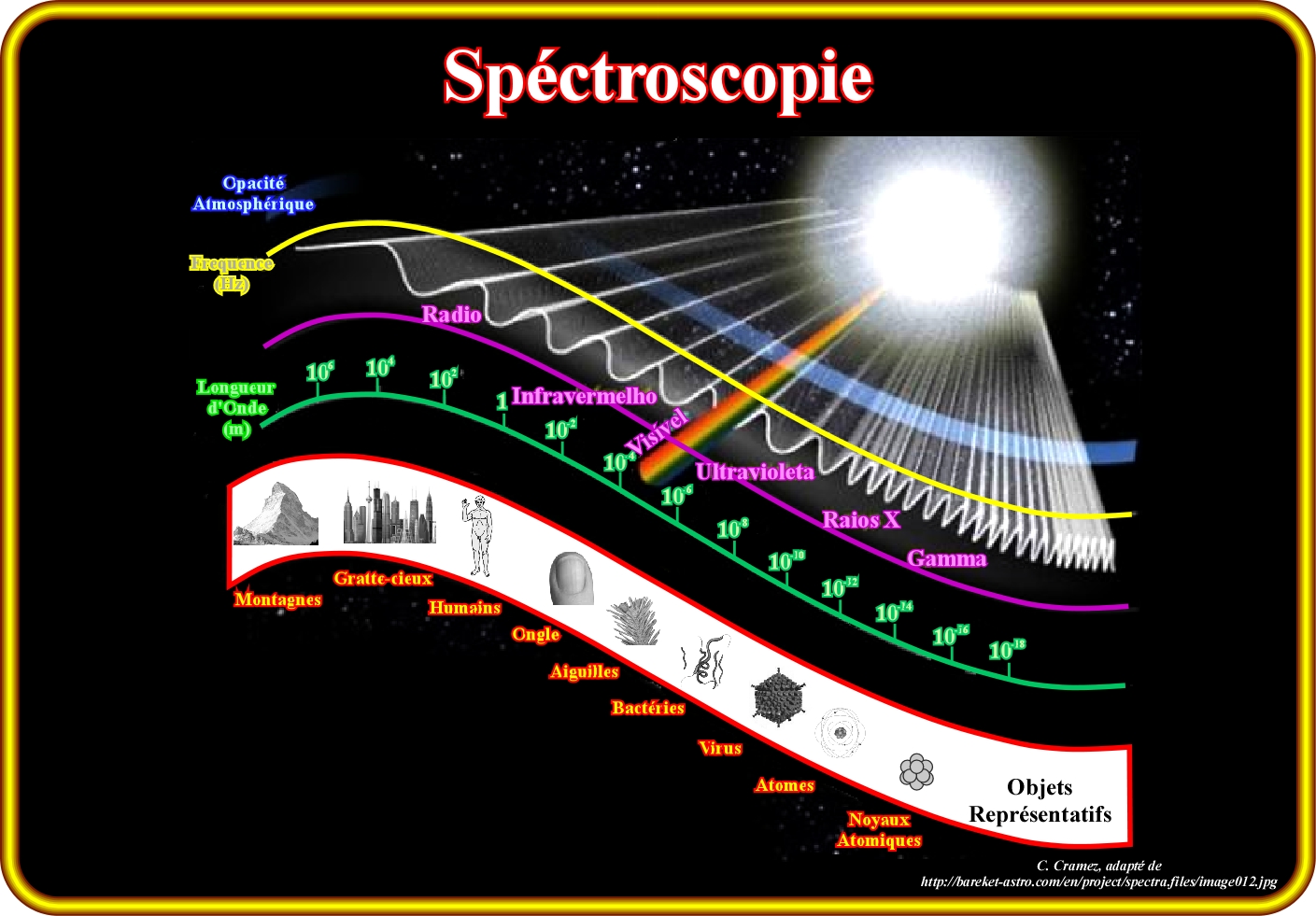 La spectroscopie est associée à la dispersion de la lumière d'un objet dans ses couleurs composantes (autrement dit, énergie). Réalisant une telle dessiccation et analyse de la lumière d'un objet, les astronomes peuvent déterminer les propriétés physiques de l'objet (comme la température, masse, luminosité et composition). La compréhension de la spectroscopie passe avant tout par une compréhension de la lumière qui acte comme une onde, mais qui a aussi des propriétés des particules. Ainsi, les ondes de lumière voyagent à la vitesse de la lumière et les différentes longueur d'onde de la lumière se manifestent comme couleurs différentes. L'énergie d'une onde de lumière est inversement proportionnel à sa longueur d'onde, ou, en d'autres mots, les ondes de basse énergie ont des longueurs d'onde longues et les ondes de lumière de haute énergie ont des longueurs d'onde petites. Ainsi, quand on regarde l'Univers sous une différente lumière ou de manière différente, c'est-à-dire, sous une longueur d'onde non-visible, nous sommes en train de sonder différents types de conditions physiques et pour cela, nous pouvons voir des nouveau types d'objets. Rayons gamma de haute énergie et rayons X permettent d'observer des galaxies actives et des restes d'étoiles massives, accrétion de matière autour des trous noirs et, tandis que la lumière visible est mieux pour observer la lumière produite par les étoiles. Il y a deux classes distinctes de spectres : (i) Continus et (ii) Discrets. Dans les continus la lumière est composée par une large et continue gamme de couleurs (énergies). Dans les discrets, on voit uniquement des distinctes claires ou sombres avec une grande définition de couleurs (énergies). Spectres discrets avec lignes brillants sont appelées spectres d'émission, et avec des lignes sombres sont des spectres d'absorption. Dans la pratique le point focal du faisceau de lumière du télescope é amenée vers la fente du spectromètre, qui est finalement captée par le détecteur. La lumière passe à travers la fente, par la suite, est réfléchie dans un miroir de collimation, qui rend parallèle le faisceau de lumière, avant de l'envoyer vers une grille de diffraction qui disperse les faisceaux parallèles de lumière dans ses couleurs composantes / longueur d'onde / énergie.