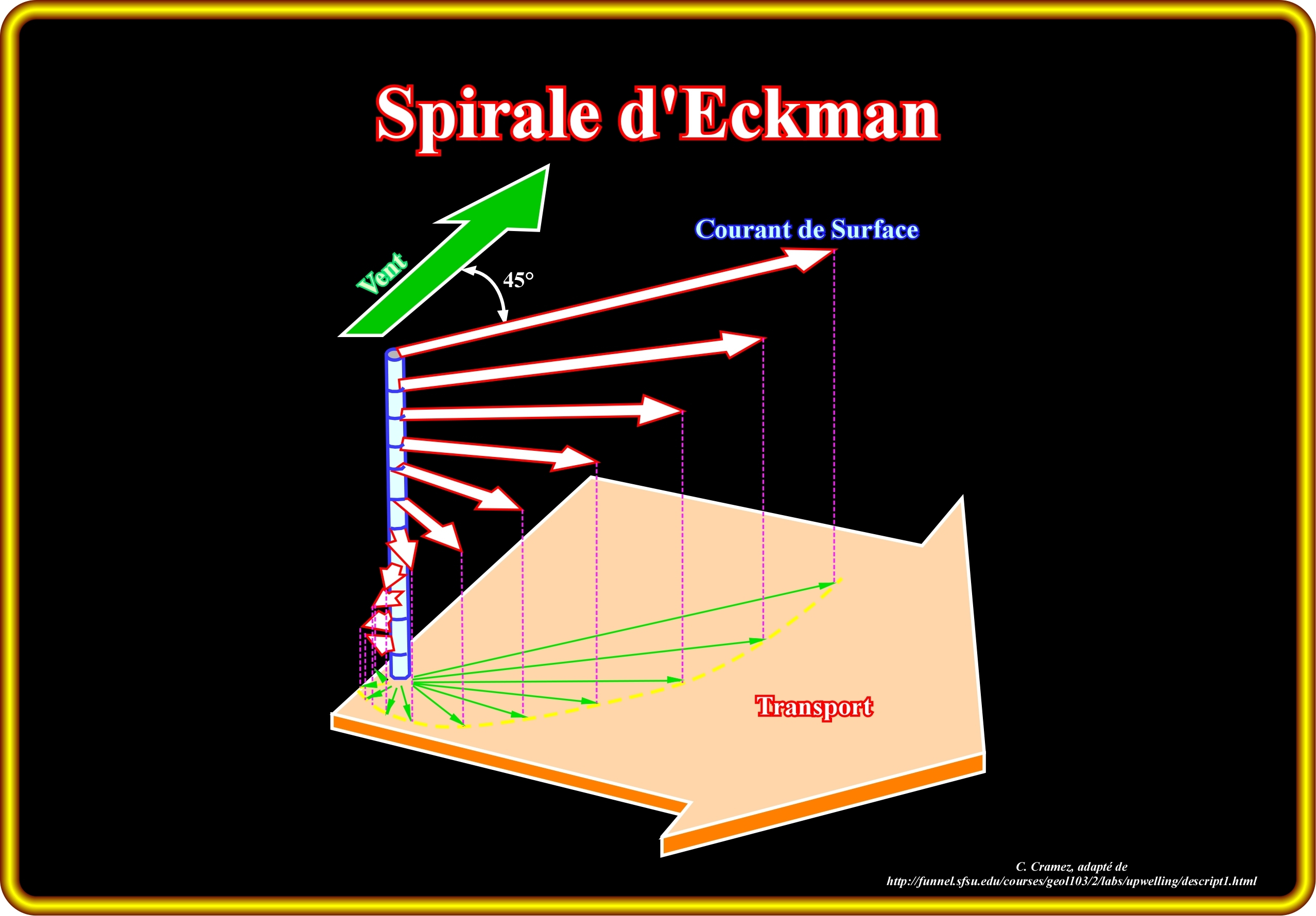 Dans la mer, le vent contrôle uniquement la partie supérieur des eaux superficielles. L'épaisseur d'eau sous-jacente à la couche supérieur en mouvement souffre une traction (par friction), mais elle est défléchie due à l'effet de Coriolis (vers la droite dans l'hémisphère nord et vers la gauche dans l'hémisphère sud). L'intervalle sous-jacent souffre une traction de la couche sus-jacente, bien que pas très forte. Il se déplace, mais il est également défléchie. Comme illustré dans ce schéma, en descendant dans la colonne d'eau, tous les intervalles ou couches d'eau sont déviés et se déplacent chaque fois plus lentement. La couche de la base de cette spirale, appelée spirale d'Eckman, peut de déplacer en direction opposée de celle de la couche de surface. En d'autres termes, on peu dire : (i) Les courants marines de surface sont influencés par l'effet de Coriolis ; (ii) L'écoulement de surface est dévié 45° par rapport à la direction du vent dû à l'effet de Coriolis ; (iii) Le vecteur vitesse est plus dévié au fur et à mesure que la profondeur augmente ; (iv) Cependant, à la profondeur de friction, le vecteur vitesse s'oriente au contraire de la direction du vent ; (v) Comme la magnitude du vecteur vitesse diminue avec la profondeur, le transport effective, appelé transport d'Eckman, est de 90° (vers la droite dans l'hémisphère nord et vers la gauche dans hémisphère sud) de la direction du vent ; (vi) Le vecteur vitesse forme une spirale appelé spiral d'Eckman qui a une géométrie hélicoïdale positive dans hémisphère nord et négative dans hémisphère sud. Notons que quand le vent provoque un mouvement d'eau superficielle vers le large (loin de la côte), la partie inférieure de l'eau se déplace, verticalement, vers le haut. Au contraire, quand le vent oblige la surface de l'eau à se déplacer vers la ligne de côte, l'eau superficielle se déplace, verticalement, vers le bas. Quand le vent souffle du nord vers le sud, l'eau superficielle se déplace vers l'ouest, autrement dit, vers loin de la côte (hémisphère nord). Un courant ascendant amène vers la surface de l'eau froide. Tandis que les eaux superficielles sont, normalement, pauvres en nutriants (phosphates et nitrates, etc.), qui sont indispensables pour la croissance des plantes, les eaux profondes et froides ont des hautes concentrations de ces nutriants.