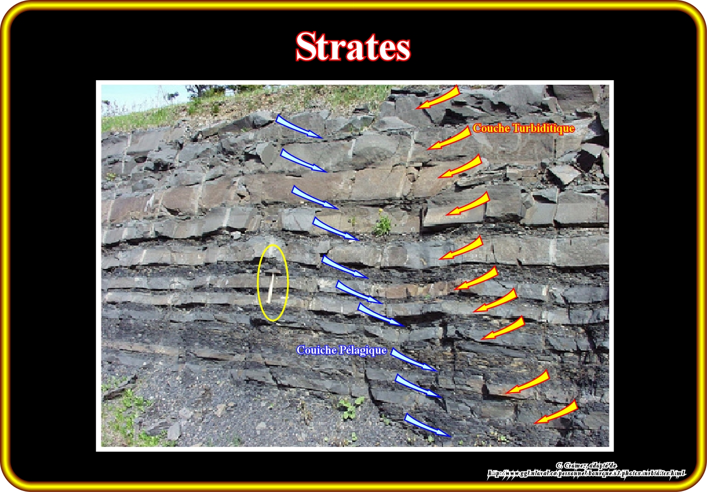 Les couches des roches sédimentaires sont, dans la plupart des fois, organisées en paquets de strates similaires superposes les uns aux autres. Ces paquets se distinguent, plus ou moins, nettement par la lithologie (calvaire, sable, argile, etc.) et par l'organisation des strates (bancs, plus au moins, fins, alternés ou non avec d'autres de différents lithologies) des paquets sus-jacents (antérieurs) ou des paquets suivants (plus récents). Un tel ensemble de couches, d'épaisseur décimétriques, s'appelle "ensemble" de couches (ou de strates) qui n'est pas autre chose qu'une part de paquets de plus grande épaisseur (hectométrique), que les géoscientistes appellent formation. Les formations (géologiques) s'opposent elles même (par la nature de la roche et l'organisation en strates) à des formations voisines dans la colonne sédimentaire. Le nom des formations, qu'on donne aux paquets successifs de strates, vient du changement de l'aspect des couches que les différencient, lequel est lié à une modification du processus de dépôt sédimentaire. Ces changements se traduisent par des modifications soit de la nature de la roche déposée (faciès), soit par la disposition des strates (stratonomie), soit par les deux (des groupes de caractères sont ceux qui servent, aussi, de base de définition des différentes catégories de formations). La superposition des couches sédimentaires d'une région comporte, en général, la superposition de plusieurs formations qui se différencient les unes des autres par ces deux types de caractéristiques (faciès et stratonomie). Les formations sont, beaucoup de fois, identifiables dans le paysage due à la différente influence qu'elles ont sur le relief et végétation. Chaque formation a un nom qui, en général, est tirée de la localité où elle est bien représentée et définie. Dans cette photo, chaque banc (strate) représente un dépôt turbiditique, autrement dit, le dépôt associé à un courant turbiditique. Dans cet exemple, les turbidites sont formés de sable. Les strates argileux entre chaque un des bancs représentent le matériel fin (argile) qui s'est déposé, par décantation, entre chaque turbidite. Un turbidite se dépose instantanément, autrement dit, en quelques heures, tandis que les dépôts argileux intercalés, entre chaque couche turbiditique, se sont déposés en des centaines voir millier d'années.