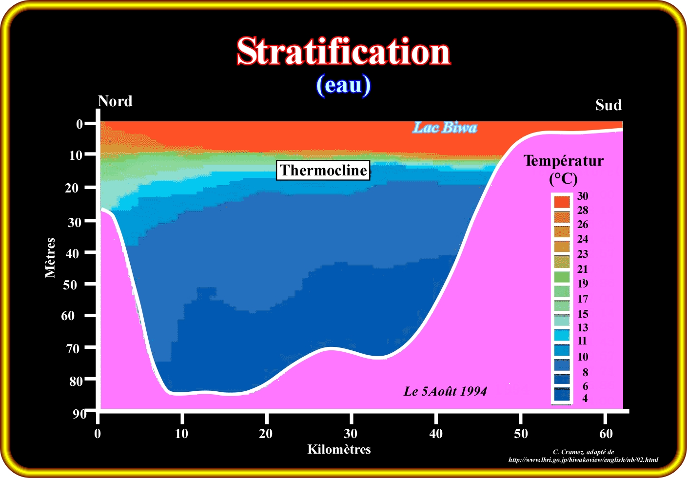 La stratification de l'eau se fait quand l'eau avec une haute et basse salinité (halocline), ou de l'eau chaude et froide (thermocline) forment des couches qui agissent somme des barrières à la miscibilité de l'eau (qualité de ce qui est miscible, c'est-à-dire, de ce qui peut être mélangé). En océanographie, la halocline désigne un fort gradient vertical de salinité. Comme la salinité affecte la densité de l'eau de mer, par exemple, elle exerce un rôle important dans la stratification verticale de l'eau. Une augmentation de la salinité de 1 kg/m^3 créée une augmentation de densité d'environ 0,7 kg/m^3. Dans les régions de latitude moyenne, quand il y a un excès d'évaporation, par rapport à la précipitation, l'eau superficielle devient plus salée que l'eau profonde. Dans ces régions, la stratification verticale est, surtout, motivée par la différence de température entre les eaux superficielles qui sont plus chaudes et les eaux profondes plus froides. La thermocline est un horizon, relativement, peu épais, mais très caractéristique des océans et lacs et même de l'atmosphère, dans lequel la température change beaucoup plus rapidement, de ce qui qui se passe dans les horizons sus-jacents et sous-jacents. Dans l'océan, la thermocline sépare les horizons supérieurs, où l'eau est beaucoup plus mélangée et agitée, des horizons inférieurs profonds, où l'eau est presque toujours en repos. Fonction des stations, latitude et turbulence créée par les vents, la thermocline peut être semi-permanent ou changer beaucoup d'épaisseur et profondeur. Cette figure illustre la stratification thermique du lac Biwa dans le Japan, Dans l'été, le gradient (taux de variation d'une grandeur physique fonction de la distance ou du temps) de température change très brusquement entre l'eau chaude, de la surface, et l'eau froid sus-jacente. La barrière entre ces deux niveaux, autrement dit, la thermocline, correspond dans cet exemple, à un horizon, sont l'épaisseur est de, plus au mois, 10 mètres, et dont la profondeur est de 15 mètres au sud et environ 30 mètres au nord. Dans ce lac, au-delà des ondes de surface, qui, très souvent sont si hautes que les ondes de la mer, la thermocline se propage comme une grande vague à travers le lac.