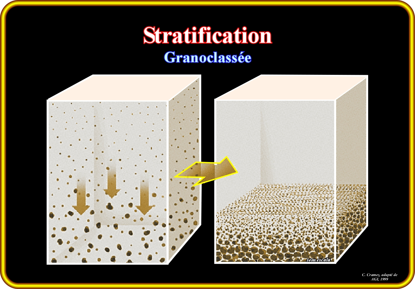 Les couches de grès, par exemple, très souvent, une stratification granoclassée comme illustré dans cette figure (droite). Ce type de stratification indique la base et le tope des couches, particulièrement, dans les régions, dans lesquelles les couches ont été raccourcies, autrement dit quand les roches ont été déformées soit par des plis soit par des failles inverses. En fait, très souvent, la position des couches sédimentaires est inversée. C'est dans ces cas, que la présence d'une stratification granoclassée est très utile aux géoscientistes, une fois qu'elle permet de vérifier si les couches sont ou non dans sa positon originelle. Si les sédiments plus grossiers sont dans le sommet des couches et les plus fins dans la base, les couches ont été inversées. Une stratification granoclassée est, normalement, expliquée par la décharge d'une certain quantité de sédiments, de types variés, dans une masse d'eau, relativement, calme (lac ou mer). Ceci arrive quand un courant entre dans un lac, mais aussi quand une part du talus continental glisse vers les parties plus profondes du bassin ou même quand un tsunami envahi une plage ou une lagune. Quand la vitesse des courants commence à diminuer, les clastes plus grossiers sont les premiers à se déposer (loi de Stokes, laquelle est valide, uniquement, quand la densité des matériaux transportés est identique), suivie du dépôt es particules plus petites, au fur et à mesure que la vitesse de l'eau est chaque fois plus faible et l'eau plus propre. L'exemple typique de ce type de stratification est produit par les courants de turbidité. Chaque couche qui est déposé de manière quasi instantané (en quelques heures), peut se diviser en plusieurs intervalles, desquels le premier est granoclassé. Chaque couche turbiditique est fossilisée par une couche pélagique qui contrairement à la turbiditique qui se dépose pendant des dizaine ou milliers d'années. Notons qu'une stratification entrecroisée traduit, toujours, un environnement de dépôt énergétique, bien que d'autres facteurs puissent être actifs.