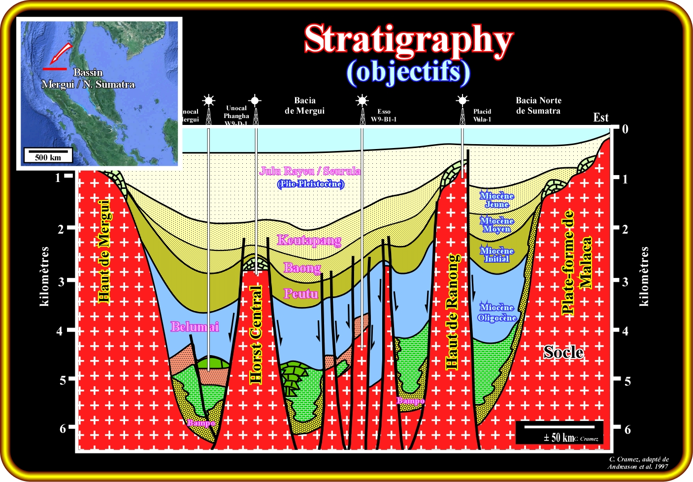 Avant tout, on doit se rappeler que n'importe quel paquet sédimentaire limité, par le haut et par le bas, par une discordance (type I), est conventionnellement un cycle stratigraphique. Traditionnellement, la sédimentologie et la stratigraphie considèrent les formations géologiques comme les unités fondamentales de l'enregistrement des roches et l'interprétation des environnements sédimentaires comme le résultat principal des études stratigraphiques. La stratigraphie séquentielle considère les cycles stratigraphiques dits cycles-séquence comme l'unité fondamentale de l'enregistrement des roches et périodes de dépôt et sans dépôt (associés avec des épisodes de montées et descentes relatives du niveau de la mer) comme une information essentielle. La stratigraphie séquentielle s'est développée à partir de la stratigraphie sismique, où les discordances se reconnaissent et se suivent relativement bien, malgré que la précision de la lithologie soit pus compliquée. L'accumulation des sédiments (comme les limites des cycles-séquence) est contrôlée par les changements do niveau de base par rapport auquel les sédiments s'accumulent, si la surface terrestre local est très basse ou sont érodées si la surface terrestre local est très haute. Cette tentative d'interprétation géologique d'une ligne sismique de l'offshore de l'Indonésie a été faite en cycles stratigraphiques dits cycles-séquence (induits par des cycles eustatiques de 3e ordre, lesquels ont un temps de durée entre 0.5 et 3-5 My). Cependant, dû aux échelles (horizontale et verticale), il est difficile d'identifier les cortèges sédimentaires qui composent les cycles-séquence. À l'exception de quelques surfaces de base des progradations comme SBP. 5 Ma, SBP, 16 Ma et SBP 24.8 Ma qui soulignent les événements transgressifs principaux du Néogène, uniquement les discordances ont été pointées. Quelques unes ont été calibrées avec les résultats des puits d'exploration, tandis que l'âge des autres a été basée dans la signature stratigraphique de la région. Notons que la différence d'âge entre deux discordances consécutives est toujours inférieure à 3 - 5 My, autrement dit, que les intervalles entre elles correspondent à des cycles-séquence, une fois que les cycles eustatiques associés sont de 3e ordre.