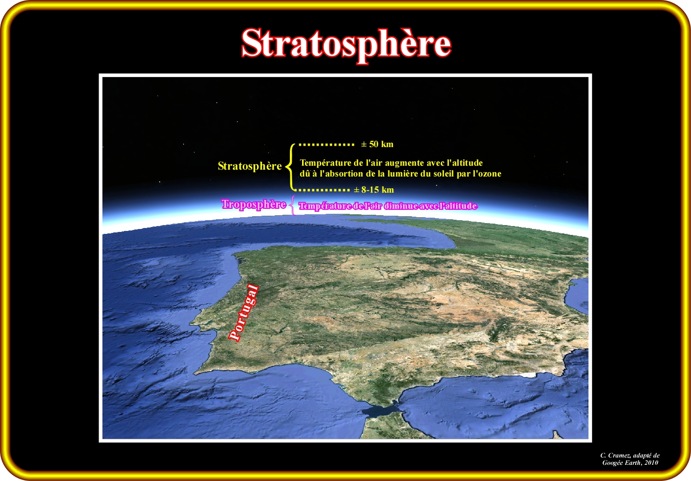 La stratosphère est une grande couche atmosphérique au-dessus de la troposphère (couche principale plus basse de l'atmosphère). Elle est limitée entre les altitudes d'environ 12 à 42 kilomètres. La température de l'air augmente lentement avec la hauteur dans la stratosphère, au contraire de ce qui arrive dans la troposphère, où la température diminue rapidement avec la hauteur. Cette rare structure dans l'évolution de la température est causée par l'absorption de la lumière du soleil par la couche d'ozone /couche basse de la stratosphère, qui entoure la Terre et qui a grandes quantités d'ozone et ainsi protège la Terre entière d'une grande partie de la radiation ultraviolet que vient du soleil). Tout le temps (état de l'atmosphère) s'arrête dans le sommet de stratosphère (appelé tropopause). La stratosphère est essentiellement libre de nuages. En fait, quand il y a une haute tempête avec des nuages en forme d'enclume, il est très probable que les cumulonimbus soit en contact avec la partie inférieure de stratosphère. Notons que les tempêtes fréquentes dans la troposphère sont caractérisées par des foudres et tonnerres, sont produites par une ou plusieurs nuages cumulonimbus (aussi connues comme des nuages de tempête). Un nuage typique de tempête a un diamètre de 10-20 km, atteint des altitudes de 10-20 km, dure en moyenne environ 30-90 minutes et se déplace avec une vitesse de 40-50 km/h. Normalement elles peuvent être identifiées par son large et brillant sommet blanchâtre, qui se projette dans la direction des vents formant une proéminence nommée anvil. Pour cela, certains géoscientistes, parlent de nuages-anvil, qui sont, pour la plupart, formées de glace et qui se localisent dans la partie supérieure des orages. La portion centrale des nuages-anvil contient de la neige lourde, qui fond quand elle tombe dans de l'air chaud, se transformant, ainsi, en pluie. Environ 50% de la pluie produite par les tempêtes se forme de cette manière. Très peu d'avions peuvent voler dans la stratosphère une fois que l'air est si fin qu'il n'y a pas de sustentation suffissent pour les maintenir en air. Cependant, quelques avions espions, comme, par exemple le U-2 et le SE-71, peuvent voler dans la partie inférieure de la stratosphère.