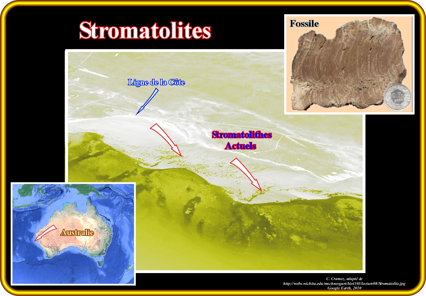 Un stromatolithe, comme structure, n'est vivante, que quand les bactéries que le constituent le sont. Fonction des cas, l'intérieur d'un stromatolithe peut être presque totalement plein ou avoir une quantité significative de vides dans lesquels les bactéries ou outres organismes se cachent. La plupart d'une colonne stromatolithe est solide, à l'exception d'une fine couche superficielle qui est la partie vivante. Cette couche vivante est formée par une gelée de filaments de cyanobactéries, comme dans les tapis bactériens. La colonne stromatolithique est construite par des processus de capture et cimentation de sédiments. En fait, la gelée de filaments : (i) Attache les particules sédimentaires entre les filaments ; (ii) Induit la cimentation des particules sédimentaires, grâce à l'activité photosynthétique, consommant CO_2, diminuant la pression partielle de CO_2 dans ce micro-environnement, ce qui provoque la précipitation du CaCO_3 ; (iii) Les particules sont piégées et, en suite, soudées entre elles, constituent une série de croûte solides qui forment une roche solide appelée laminite cyanobactérienne. Les stromatolithes existent depuis il y a environ 3.5 milliards d'années, comme le suggèrent les fossiles trouvées dans l'ouest de l'Australie, mais ils existent en tous les continents. Les premières publications scientifiques suggéraient que les stromatolithes ont atteint un maximum d'extension et de diversité de formes et structures dans le Pré-Cambrien (il y a environ 1.5 Ga), qui se sont maintenues jusqu'à environ 700 Ma. Cependant, des données plus récentes montrent que le nombre et la diversité a diminué beaucoup avant au bénéfice d'autres espèces. Beaucoup de géeoscientistes pensent, actuellement, que les stromatolithes étaient la seule forme de vie, ou forme de vie plus dominante jusqu'à environ 550 Ma, ce que veut dire, que le déclin de la diversité a été initié plus tôt de ce qu'on pensait auparavant. Au contraire, leur persistance est de plus de 1 Gy. L'acmé de leur diversité a été, probablement, entre 1-1.3 Ga et, après. elle a tombé à 75% (entre 1.0 et0.7 Ga) pour, finalement, tomber à moins de 20% au début du Cambrien.
