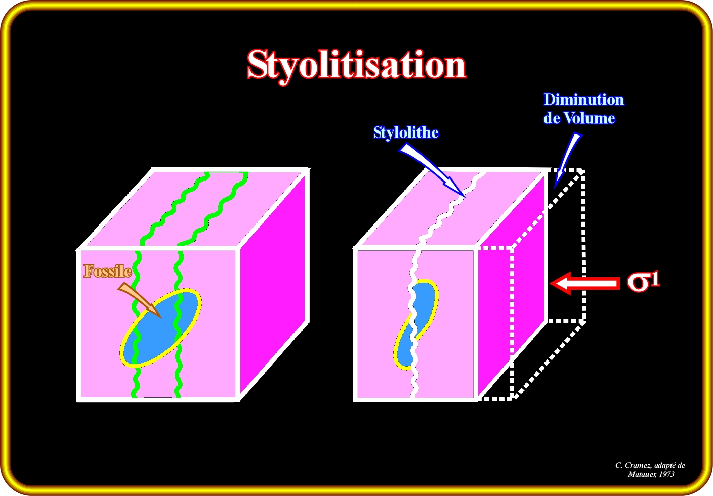 Ces schémas montrent comment la direction des pics des stylolithes souligne la direction de l'axe principal de l'ellipsoïde des contraintes effectives (σ_1), une fois que le plan des stylolithes donne le plan d'intersection entre σ_2 et σ_3. Comme dans cet exemple σ_1 est horizontal, les sédiments ont été raccourcis, soit par des plis (anticlinaux ou synclinaux), soit par des failles inverses, soit par une combinaison de failles inverses et plis. La direction des structures qui raccourcissent les sédiments, autrement dit, la direction du plan axial des anticlinaux ou la direction des plans des failles est toujours parallèle à σ_2. Si σ_2 est horizontal (σ_3 vertical), les failles qui affectent les sédiments sont des failles inverses et les plis cylindriques. Si σ_2 est vertical (σ3 horizontal), les failles, qui raccourcissent les sédiments, sont des failles de décrochement et les plis associés sont coniques, ce qui veut dire, qu'elles ne sont pas exactement perpendiculaires à σ_1. Quand, les pics des stylolithes sont verticaux, ça veut dire que les sédiments ont été allongés par un régime tectonique extensif, une fois que σ_1 est vertical. Dans ce cas, la direction des failles normales est parallèle à σ_2. Ainsi, l'axe σ_2 est donné par l'intersection de deux failles normales avec polarité (inclinaison) opposée. Ces schémas montrent, aussi, comment on peut calculer, approximativement, la quantité de matériel qui s'est dissout pendant la déformation. En fait, en imaginant un fossile, par exemple une trilobite, avant et après la stylolitisation, il est facile de calculer, plus au moins, la quantité de matériel qui a disparu par dissolution. Ceci est très important, surtout dans les régions calcaires, pour savoir, par exemple, s'il y a un sens d'équilibrer ou non une coupe géologique, une fois que presque toutes les méthodes d'équilibrage sont basées dans la loi de Goguel. Notons que cette loi dit que pendant la déformation la quantité de matériel se conserve, plus au moins, constante (tenant en compte la compaction). Cependant, comme illustré dans cette figure, dans le cas des roches carbonatées, une dissolution importante peut altérer de manière significative de la loi de Goguel.