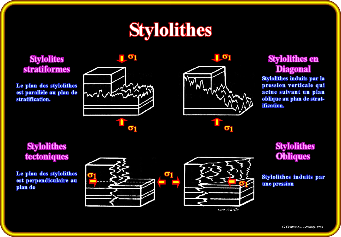 Un stylolithe est une surface, ou un contact, plus au moins, irrégulier qui se forme, en général, dans les roches carbonatées et qui souligne une pénétration entre deux blocs de la même roche. La plupart des géoscientistes pense que les stylolithes sont formées de manière diagénétique par des mouvements tectoniques, sous pression, et accompagnés de dissolution. En d'autres mots, les stylolithes sont des surfaces qui se forment dans certaines roches, en générale carbonatées, le long desquelles il y a eu une dissolution, qui est soulignée par des minéraux argileux insolubles qui restent en place, même après que la calcite ait été dissoute et transporté vers d'autres régions. Ceci veut dire que les stylolithes résultent, surtout, de la compaction et pression des fluides pendant la diagénèse et qui peuvent être, plus au moins, allongés par une subséquent écoulement des eaux souterraines. En fait, les stylolithes sont visibles dans les affleurements et échantillons comme des discontinuités irrégulières en zigzag, lesquelles, parfois, sont renforcées par les insolubles d'argile, oxydes de fer ou matériel organique. Des études sur les stylolithes et outres structures induites par la pression des solutions minérales suggèrent qu'elles peuvent avoir des origines diverses. Entre elles, la pression des solutions est, généralement, l'origine la plus probable. Cependant, il y a un certain nombre de problèmes dans ce que concerne la genèse des stylolithes. Dans les diagrammes illustrés dans cette figure, le pic des stylolithes correspond toujours à σ_1, autrement dit, à l'axe principal de l'ellipsoïde des contraintes effectives (somme de la pression géostatique, pression hydrostatique et du vecteur tectonique). Dans les études de terrain, la détermination de σ_1 permet de déterminer le régime tectonique qui a déformer la région. Si σ_1 est vertical, les sédiments sont allongés par un régime extensif et la direction des failles normales, qui permettent l'allongement, est parallèle à σ_2 . Si σ1 est horizontal, les sédiments sont raccourcis, par un régime tectonique compressif, soit par des anticlinaux-synclinaux soit par des failles inverses. La direction des plis et plans des failles inverses est parallèle à σ_2. Notons, qu'il y a une seule façon d'allonger les sédiments (failles normales) et deux manières de les raccourcir (plis et failles inverses).