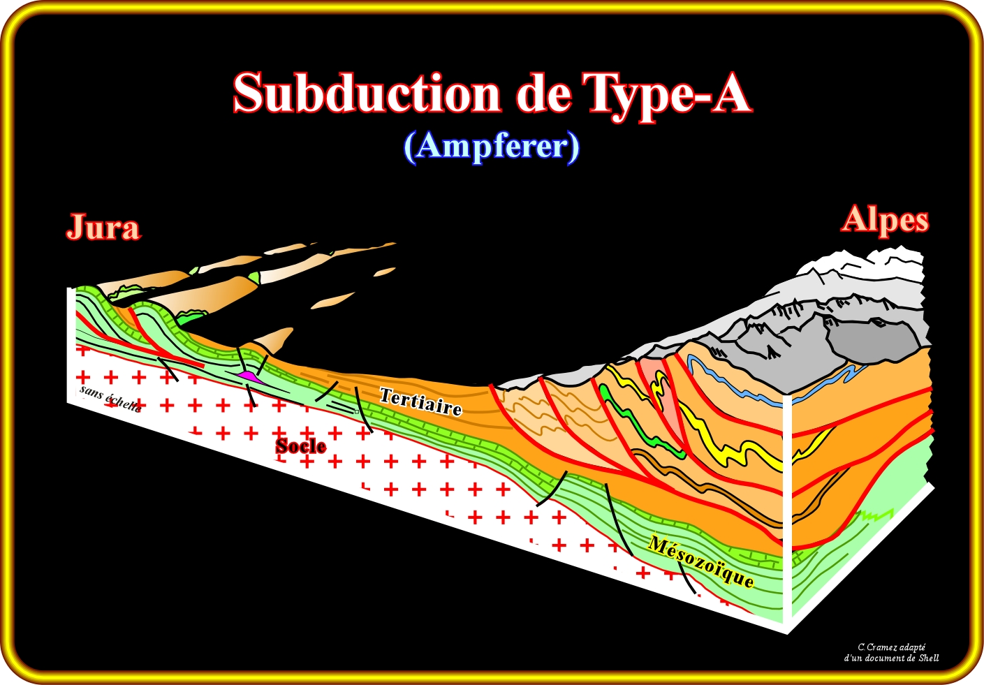 Ce bloc diagramme illustre de manière schématique la zone de subduction de type-A associée avec la collision entre la marge divergente nord de la Mer de Téthys et le continent Gondwana. La marge Mésozoïque qui forme les montagnes du Jura, se comporte comme la plaque lithosphérique descendante et plonge sous la chaîne de montagnes des Alpes, la quelle se comporte comme la plaque lithosphérique chevauchante. Dans la plaque descendante, le raccourcissement se fait par des plis et failles inverses qui s'amortissent et disparaissent en profondeur dans un niveau salifère qui se trouve, plus au moins, à environ 800 mètres de la surface. Dans la plaque chevauchante, le raccourcissement se fait, surtout, pat des grands chevauchements qui affectent différents niveaux stratigraphiques, mais qui semblent se fusionner en profondeur. Le raccourcissement dans la plaque chevauchante est beaucoup plus important que dans la plaque descendante. Ceci fait penser, qu'une partie de la plaque descendante a été absorbé, en profondeur, par l'asthénosphère, mais, pour le moment, il n'existe aucune preuve d'un tel mécanisme. On peut dire que les zones de subduction de type-A ou d'Ampferer (le géoscientiste qui les as reconnu par la première fois) sont des endroits où une partie de la croûte continentale se retrouve enfouie, à des grandes profondeurs), sous une mégasuture. Cette condition géologique implique, dans la couverture sédimentaire, la formation, à grande échelle de surfaces de décollement, plis et failles inverses. Au début, la plupart des adeptes de la théorie des plaques tectoniques n'a pas accepté ce type de subduction, une fois que la densité de la croûte continentale est, relativement, petite et, pour cela, elle a tendance à flotter et à résister à une enfouissement important. Depuis les travaux de Molnar et Gray (1979) qui suggèrent que même la croûte continentale inférieure peut entrer en subduction et s'individualiser dans la croûte supérieure, la plupart des géoscientistes pense que les zones de subduction de type-A existent. Aussi, Bird et al. (1975) ont montré que certaines conditions thermiques et mécaniques sont capables de produire des laminations dans la lithosphère, qui permettent à la croûte continentale inférieure, plus dense, d'entrer en subduction dans l'asthénosphère.
