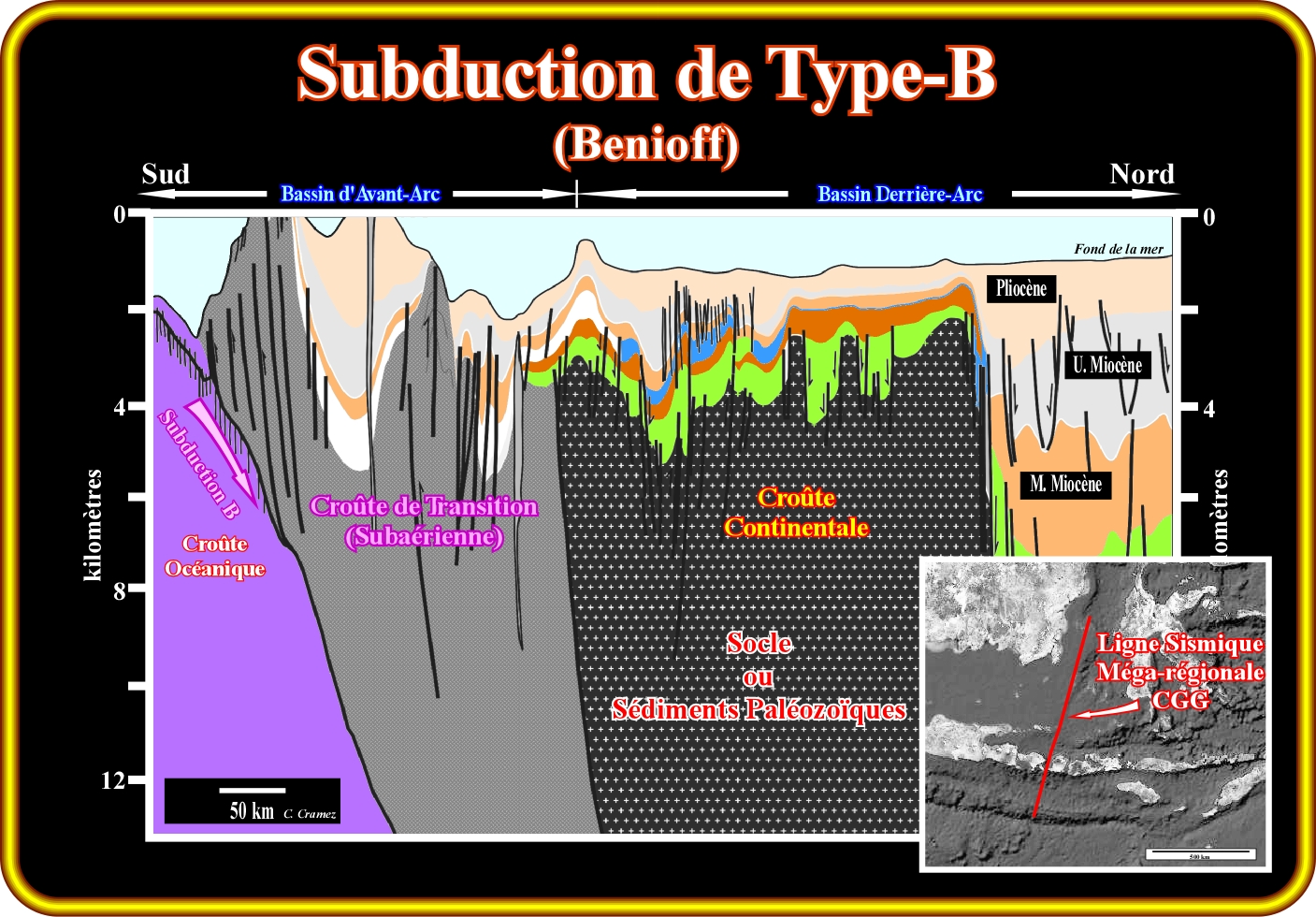Comme illustré dans cette tentative d'interprétation géologique d'une ligne sismique régionale de l'offshore de l'Indonésie, les zones de subduction de type-B (ou de Benioff) sont caractérisées par le plongement de la plaque lithosphérique océanique dans l'asthénosphère. Au fur et à mesure que la couche basaltique et la couverture sédimentaire s'enfouissent, leurs températures augmentent. Dès que la température de fusion de la mixture basalte - eau - sédiments est atteinte tout le matériel fond créant un magma volcanique. Comme ce magma est moins dense que le manteau que l'enveloppe, il remonte à la surface et forme des volcans, dans la plaque chevauchante. Ceci explique l'une des caractéristiques principales des zones de subduction du type-B, autrement dit, la formation de volcans, dans la plaque chevauchante, à une certaine distance de la fosse océanique. Cette distance est fonction de l'angle du subduction qui est le angle entre la plaque descendante et la surface de la Terre. Cet angle dépend de trois paramètres : (i) État thermique, autrement dit, plus la plaque descendante est jeune, plus elle est légère et plus petit est l'angle de subduction, une fois que la résistance à l'entrée de la plaque dans l'asthénosphère est très grande : (ii) Rhéologie des régions voisine, c'est-à-dire, que si la lithosphère océanique voisine a une densité faible, elle peut, au moment d'entrer en subduction, induire des déformations en extension, qui réduisent l'angle de subsidence ; (iii) Vitesse relative des plaques (si la vitesse relative entre les plaques est petite, la composante vertical du plongement a tout le temps pour devenir prépondérante et, ainsi, augmenter l'angle de subduction) ; (iv) Vitesse de la plaque chevauchante (quand la plaque chevauchante se déplace en direction de la fosse océanique, l'angle de subduction est plus petit que quand elle se déplace dans une autre direction).