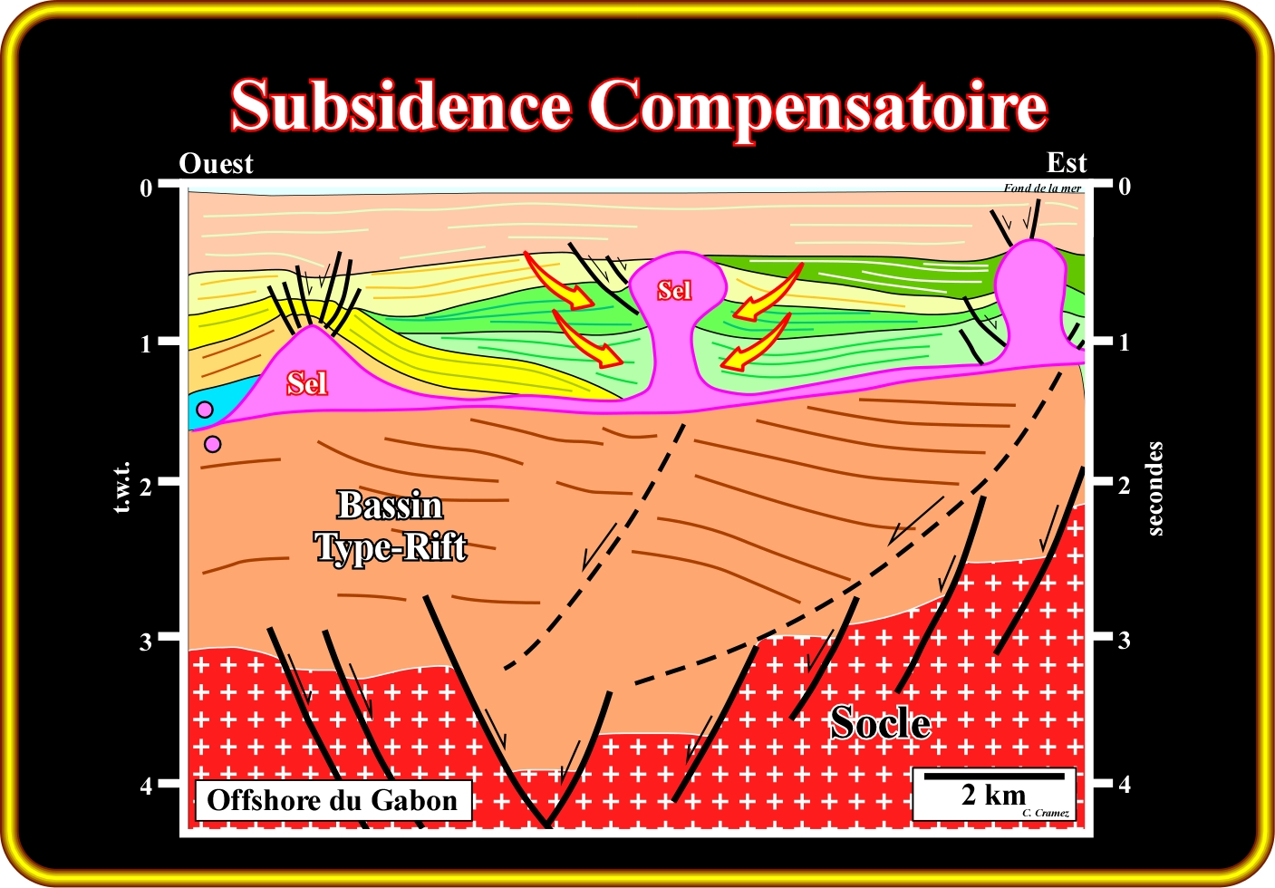 Dans cette tentative d'interprétation géologique d'une ligne sismique de l'offshore du Gabon, il est facile de comprendre ce qui est la subsidence compensatoire créée par l'écoulement latéral et vertical d'un horizon évaporitique. Dans cette région, au-dessus du bassin de type-rifte, dont la limite supérieur est marquée par la discordance induite par la rupture de la lithosphère, s'est déposé un intervalle sableux d'épaisseur inférieur à résolution sismique. Cet intervalle qui n'est pas visible sur les lignes sismique, mais qui a été reconnu en tous les puits d'exploration qui ont dépassé la base du sel, est couvert par un épais intervalle salifère. Ainsi, grossièrement, on peut dire que, dans ce cas particulier, la discordance induite par la rupture correspond à la base du sel, laquelle à une légère inclinaison en direction du bassin. Cette inclinaison souligne le basculement de la marge vers l'aval (Ouest). Cette géométrie, ainsi que celle des bassins de type-rift, contraste, fortement, avec la géométrie des sédiments postérieurs au dépôt des évaporites. Les variations d'épaisseur et configuration des différents intervalles post-salifères peuvent uniquement s'expliquer par une subsidence compensatoire créée par l'écoulement du sel. Notons que dans l'extrémité Ouest de cette tentative (en aval du dernier dôme de sel), le niveau salifère a disparu complètement ce qui a crée une suture salifère (soulignée par deux cercles). En fait, quand le sel s'écoule (par des basins ou vers le haut, mais sans atteindre le fond de la mer), les sédiments sus-jacents s'effondrent, créant de cette façon espace disponible pour le dépôt de nouveau sédiments, une fois que la nature à horreur du vide. Ce sont les mouvements du sel qui créent la disharmonie tectonique entre le sédiments infra- et post-salifères, laquelle est, parfaitement, visible dans cette tentative. Les mouvements du sel sont, principalement, induits par le contraste de densité entre le sel (2.15 - 2.17) et les sédiments, et par le fait que le sel ne se compacte, en profondeur, ce qui n'est pas le cas des sédiments.