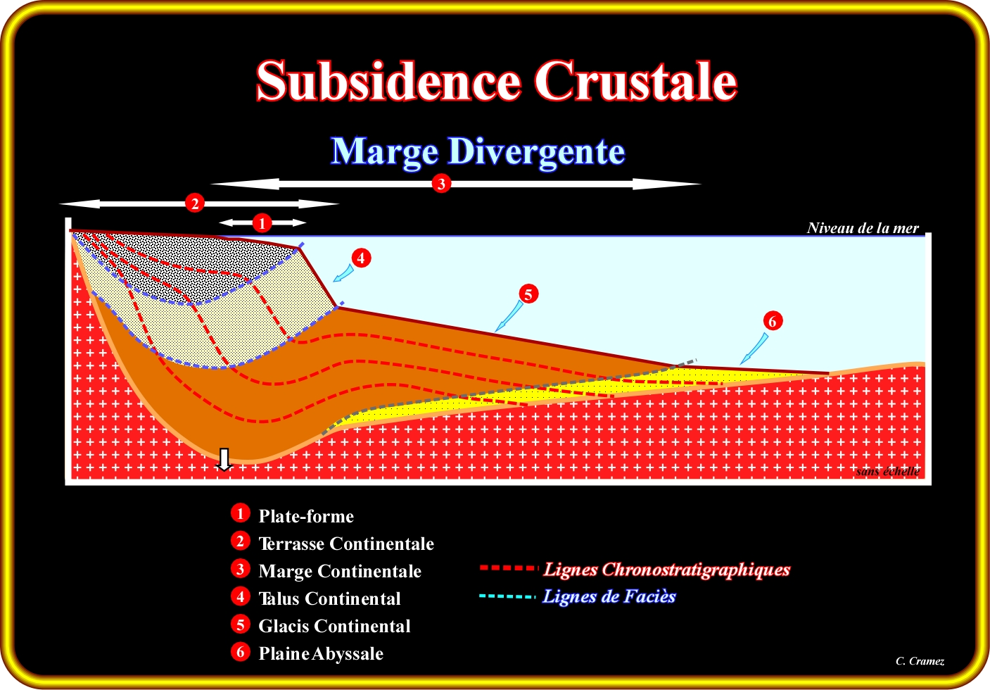 Une accumulation de sédiments et la formation des bassins sédimentaires est fonction de la subsidence crustale. Au début de la formation d'un bassin sédimentaire, la subsidence tectonique doit être antérieure à la sédimentation. Plus tard, la subsidence crustale est, aussi, induite par l'augmentation de la charge sédimentaire (subsidence totale), comme illustrée dans ce schéma d'une marge continentale divergente. La subsidence tectonique est égale à la subsidence totale (épaisseur des sédiments ajoutée de la profondeur d'eau) diminuée de l'effet de la compensation isostatique (dû à la surcharge sédimentaire) et augmentée de l'effet de la compaction. La subsidence tectonique de la surface terrestre ou du fond de la mer est contrôlée par : (i) Principe de l'isostasie ; (ii) Contraction thermique de la lithosphère et (iii) Flexure par chargement. D'après le principe de l'isostasie (compensation de masses et densités entre les masses lithosphériques et l'asthénosphère), le soulèvement du sommet de la croûte est fonction de l'épaisseur et densités des plusieurs couches terrestres qui du haut vers le bas sont : (a) Eau de mer ; (b) Sédiments ; (c) Croûte solide qui est constituée par des roches ignées et métamorphiques et (d) La partie supérieure du manteau lithosphérique qui repose sur l'asthénosphère (ou manteau asthénosphérique). Dans l'asthénosphère, les surfaces horizontales sont sous une pression constante, c'est-à-dire, que n'importe où, la masse pour unité de la colonne rocheuse sus-jacente est constante : ρwhw + ρshs + ρchc + ρmhm + ρaha = constant, où h est l'épaisseur, ρ la densité, w la couche d'eau, s la couche sédimentaire, c la croûte, m le manteau lithosphérique et a le manteau asthénosphérique. La base de la lithosphère correspond à une limite de température (± 1350° C). Le manteau asthénosphérique est moins dense que le manteau lithosphérique (moins épais) cause un soulèvement de la surface terrestre ou du fond de la mer, tandis qu'un épaississement du manteau lithosphérique, fait à partir de la croûte (diminution d'épaisseur), créée une subsidence. Ainsi, la croûte continentale épaissie se soulève au-dessus de la mer, tandis que le sommet de la croûte océanique, plus mince, se trouve quelques kilomètres plus bas.