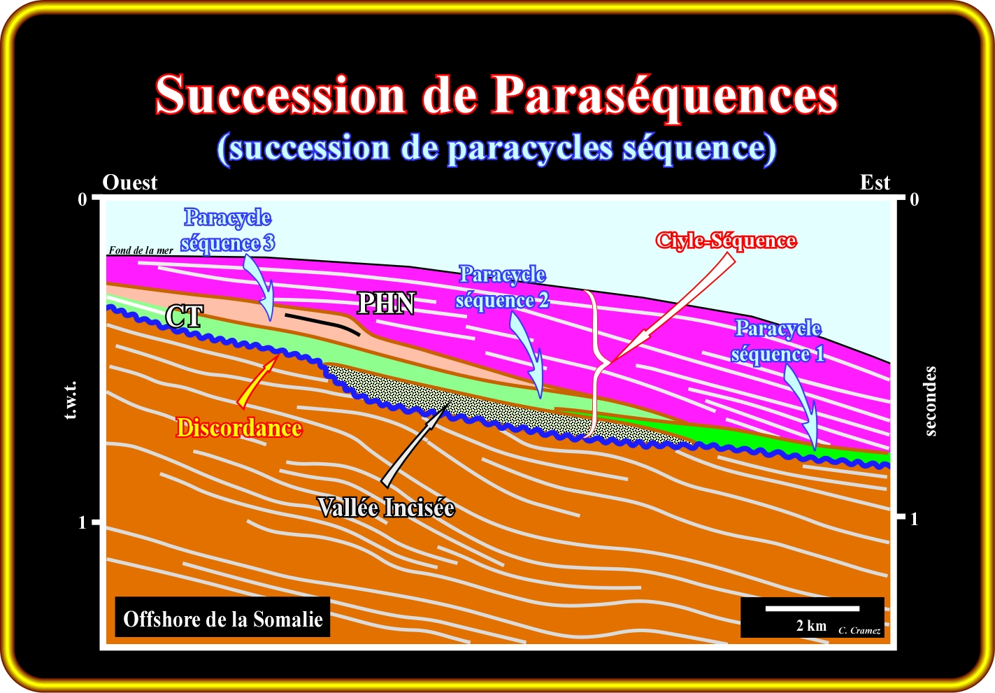 Avant tout, il faut se rappeler, qu'en français, comme d'ailleurs en anglais, le terme paraséquence n'est pas très correct et doit, toujours que possible, être remplacé par paracycle du cycle-séquence. En fait, un tel intervalle sédimentaire est associé à des paracycles eustatiques et non à des cycles eustatiques, ce qui veut dire, que chaque paracycle du cycle-séquence est déposé pendant une période de stabilité qui suit une montée relative d'un niveau de la mer et qu'entre le dépôt de chaque paracycle il n'y a aucune chute relative du niveau de la mer. En d'autres termes, dans un ensemble de paracycles du cycle-séquence, qu'au début les géoscientistes d'Exxon appelaient ensemble de paraséquences, le niveau relative de la mer a, toujours, monté (en accélération les cortèges transgressifs et en décélération dans les prismes de bas et haut niveau), c'est-à-dire, qu'il n'y a aucun chute relative du niveau de la mer entre chaque paracycle. Ceci veut dire, qu'un ensemble de paracycles n'est pas associé à aucun type de cycle eustatique, mais qu'il fait partie d'un cycle, d'où le nom paracycle. Comme illustré dans cette tentative d'interprétation géologique d'une ligne sismique de l'offshore de la Somalie, la cyclicité des variations relatives du niveau de la mer est donnée par le cycle-séquence limité entre la discordance (ligne ondulée) et le fond de la mer. Dans ce cycle-séquence, du haut vers le bas, on reconnaît: (i) Le remplissage d'une vallée incisée, lequel a éte fait pendant le dépôt du prisme de bas niveau, qui n'est pas visible dans cette tentative, mais bien développée à l'Est de cette ligne ; (ii) Cortège transgressif (CT), lequel est composé par la superposition de trois paracycles, déposés par trois montées relatives successives (sans chutes relatives entre elles) du niveau de la mer et (iii) Un prisme de haut niveau (PNA) caractérisé par une géométrie qui contraste avec la géométrie rétrogradante du cortège transgressif.