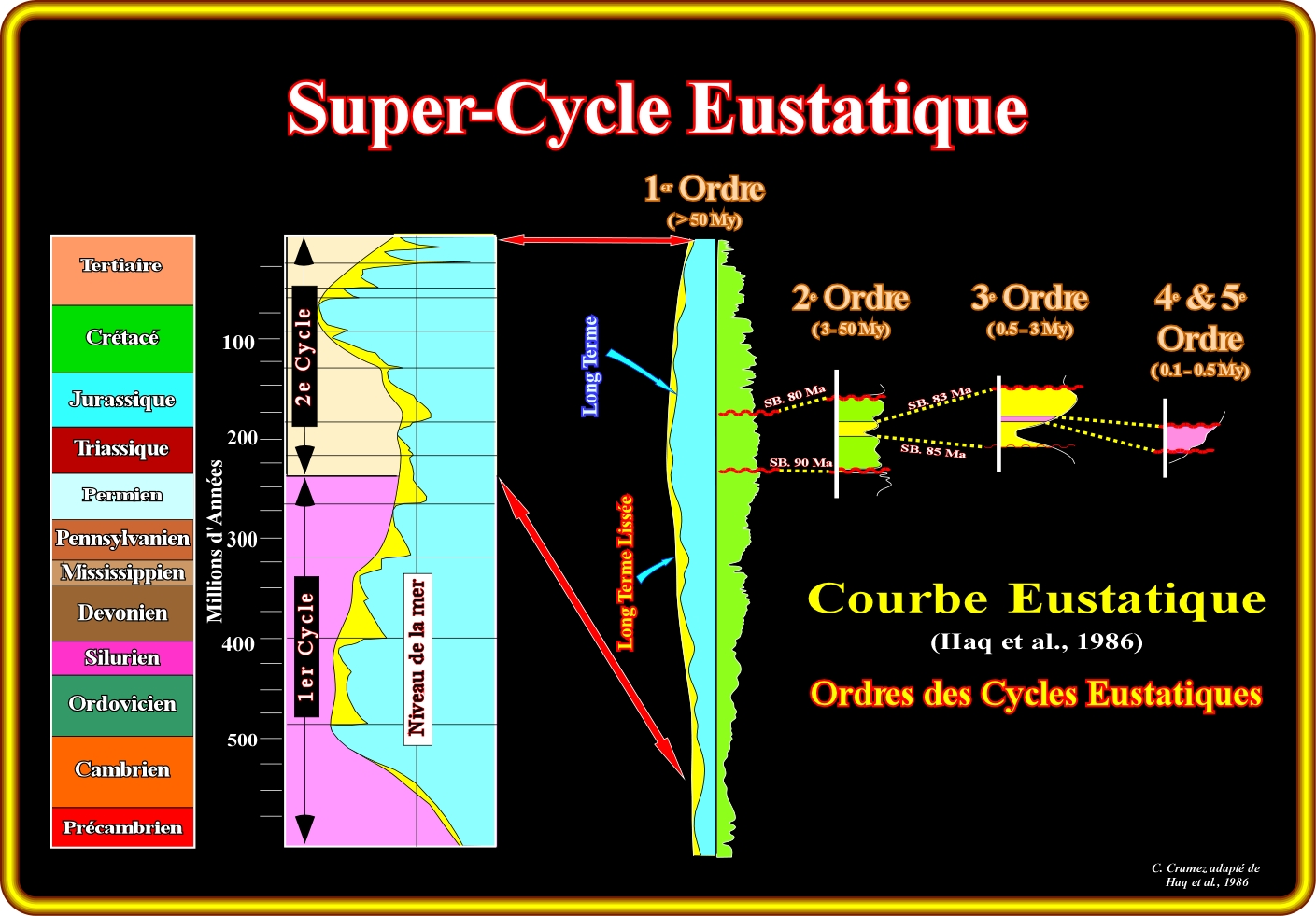 Dans la courbe des variations relatives du niveau de la mer proposée par Exxon qui est schématisée dans cette figure, on peut considérer cinq ordres de cycles eustatiques : (i) Cycles eustatiques de 1er ordre (mégacycle d'Exxon) qui ont un temps de durée supérieur à 50 Ma (généralement, entre 250 et 350 My) et qui sont induits par la rupture des supercontinents ; (ii) Cycles eustatiques de 2e ordre (supercycle d'Exxon) qui ont un laps de temps entre 3-5 Ma et 50 Ma et qui sont, probablement, induits par des variations de la subsidence tectonique /étirement, refroidissement et chargement tectonique) ; (iii) Cycles eustatiques de 3e ordre qui ont une durée entre 0.5 Ma et 3-5 Ma et que sont, probablement, induits par la glacio-eustasie et (iv) Cycles de 4e et 5e ordre, appelées, aussi, cycles de haute fréquence qui semblent être induits par les variation climatiques créées par les cycles orbitaux de Milankovitch. Ainsi, comme schématise ci-dessus, on peut dire que les roches qui forment l'énothème Phanérozoïque se sont déposées en association avec deux cycles eustatique de 1er ordre. Le premier cycle a induit le dépôt des roches de l’érathème Paléozoïque et semble avoir été induit par la rupture du supercontinent Proto-Pangée (Rodhinia) et subséquente dérive-collision des continents, ce qui a fait varier le volume des bassins océaniques. Le deuxième cycle eustatique de 1er ordre a été induit par la rupture de la Pangée (dérive et collision des continents) et a permis le dépôt des roches des erathèmes Mésozoïque et Cénozoïque. Naturellement, chacun de ces cycles eustatiques, par définition, a un acmé. Lev cycle eustatique de 1er ordre de la base du Phanérozoïque est composé par quatre (ou cinq) cycles eustatiques de 2e ordre, tandis que celui du sommet est composé par huit cycles de 2e ordre. Chacun de ces cycles, par définition, à un pic maximum, qui peut, encore, être considéré comme eustatique (global et non relatif), ce qui, probablement, n'est pas le cas pour les cycles de 3e ordre.