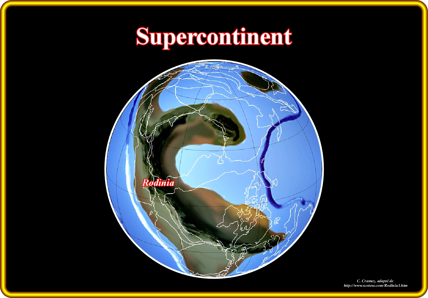 La plupart des géoscientistes qui s'occupent de la paléogéographie utilisent le terme de supercontinent pour désigner un corps géologique uniforme qui englobe tous les continents connus actuellement, ce qui veut dire, que les continents, grosso-modo, les continents actuels, se sont, par fois, trouvés agglutinés dans une ou quelques (3-5) plaques lithosphériques. Le plus ancien supercontinent que les géoscientistes sont arrivé à reconstituer est le Vaalbara, qui s'est formé à partir de proto-continents il y a environ 3.1 Ga. Le supercontinent Vaalbara s'est fracturé il y a environ 2.8 Ma. Le supercontinent Kenorland s'est formé il y a environ 2.7 Ma et s'est fracturé, il y a environ 2.5 Ga, en différents continents appelés : (i) Laurentia ; (ii) Baltica ; (iii) Australie et (iv) Kalahari. Le supercontinent Columbia s'est formé et s'est fracture durant une période qui varie entre 1.8 et 1.5 Ga. Le supercontinent Rodhinia ou Proto-Pangée, illustré dans cette figure, c'est fracturé il y a environ 750 M. Un des fragments résultants de la fracturation du Proto-Pangée englobe grands parties des continents situés, actuellement, dans hémisphère sud. Cependant, la tectonique des plaques a agglutiné autre fois les fragments des continents individualisés après la rupture du Proto-Pangée pour former le supercontinent Pangée, à la fin de l'ère Paléozoïque. À son tour la Pangée s'est fracturée en deux grands continents la Laurasia, au nord, et le Gondwana, au sud. Des études géologiques récentes suggèrent que les supercontinents se sont formé pendant des cycle (fracturation, dispersion, agglutination, fracturation) de durée, plus au moins, de 250 My. Pendant la fracturation et dispersion des supercontinents, le niveau de la mer, globalement, monte (diminution du volume des bassins océaniques), tandis qu'il descend pendant l'agglutination des continentes (augmentation du volume des bassins océaniques). Le supercontinent Rodhinia, illustré ci-dessus, s'est formé il y a environ 1.1 Ga. La taille et configuration de la Rodhinia sont très spéculatives, l'Amérique du Nord semble avoir formé le noyau de la Rodinia. La partie Est de l'Amérique du Nord semble avoir été adjacente à la partie Ouest de l'Amérique du Sud et près de l'Australie et Antarctique.