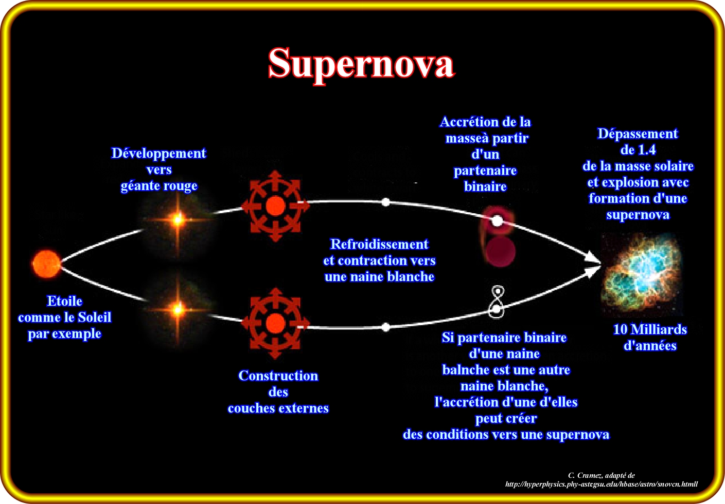 Explosion catastrophique et subite d'une étoile qui a consommée ses réserves de combustible (hydrogène). Les éléments plus lourds, qui sont essentiels pour la vie, se sont formés durant les événements qui amènent à la formation d'une supernova et à l'intérieur de celle-ci.