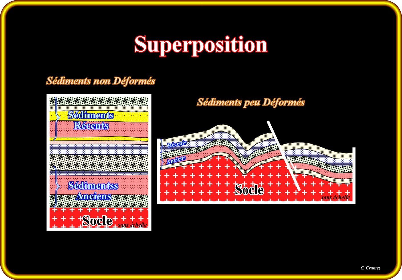 Concept de datation, en âge relatif, dans les roches stratifiées. Dans une série de roches sédimentaires non ou légèrement déformées, la couche supérieure est toujours plus jeune et la couche plus inférieure est toujours la plus ancienne.