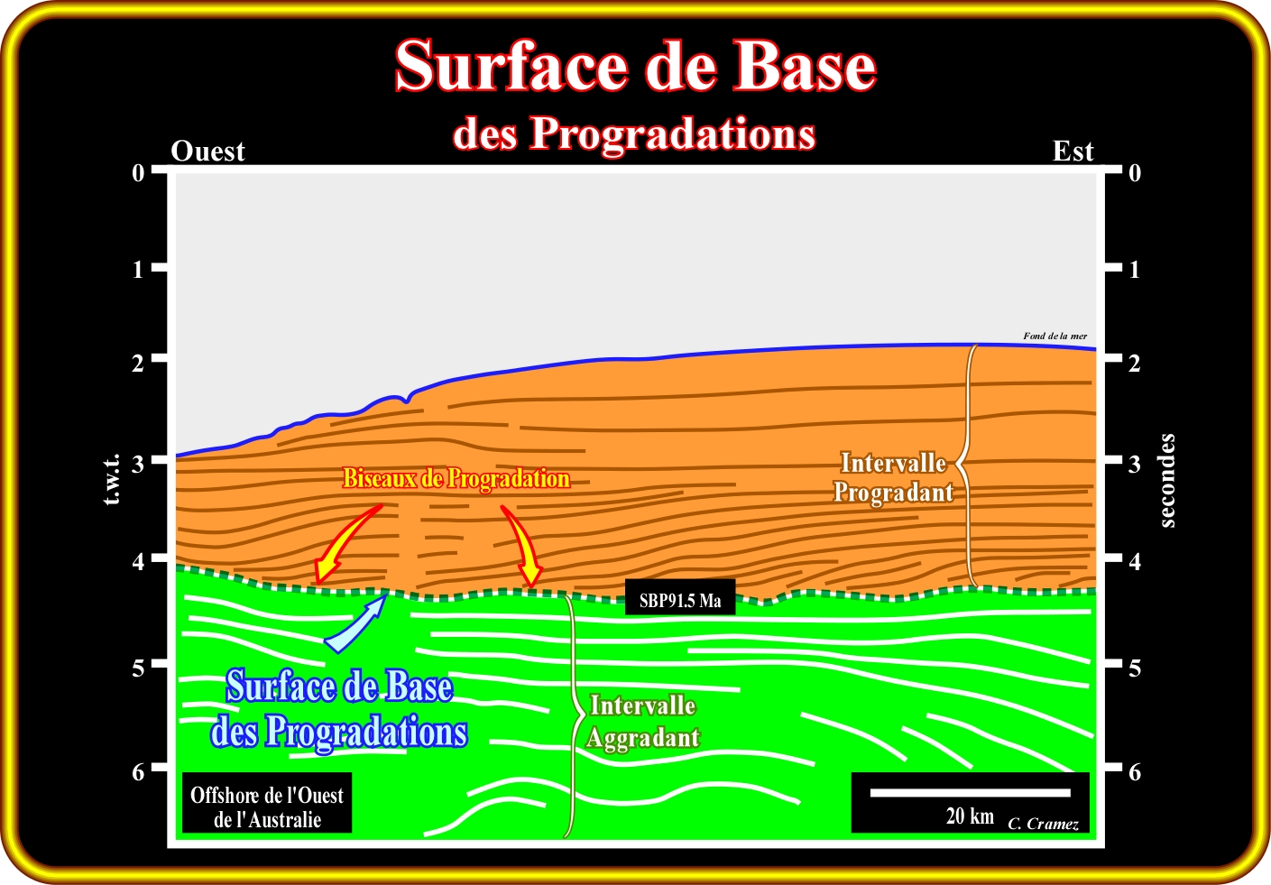 Dans un cycle stratigraphique dit cycle-séquence (induit par un cycle eustatique de 3e ordre qui est caractérisé par une durée entre 0.5 My et 3 - 5 My) on peut observer trois surfaces de base des progradations (quand le cycle stratigraphique est complet) : (i) La surface d'inondation maximale ; (ii) La limite supérieure des cônes sous-marins de bassin et (iii) La limite supérieure des cônes sous-marins de talus. La première de ces surfaces marque la limite entre le cortège transgressif (CT) et le cortège de haut niveau (CHN), autrement dit, elle sépare les deux membres (presque toujours appelés cortèges par la plupart des géoscientistes) du cortège de haut niveau (CHN). La deuxième qui se localise en aval du rebord du bassin (dernier rebord du bassin du cycle-séquence précédent), marque la limite entre les cônes sous-marins de bassin (CSB) et de talus (CST). La troisième, également localisée dans le cortège de bas niveau (CBN), marque la limite entre le prisme sédimentaire de bas niveau (PBN) et les cônes sous-marins de talus. Par définition, ces surfaces limitent les intervalles sédimentaires aggradants (par fois même rétrogradants) des intervalles progradant sus-jacents. Dans cette tentative d'interprétation géologique d'une ligne sismique de l'offshore de l'Australie, il est facile de voir que les successifs biseaux de progradation créent une surface de base des progradation, laquelle est caractérisée par une augmentation de l'hiatus de non-dépôt, entre l'intervalle transgressif et régressif, en direction de la mer. Les surfaces de base des progradations se développent pendant des périodes de haut et bas niveau de la mer. Les surfaces de base des progradations associées avec les cycles eustatiques de 1er ordre s'appellent surfaces de base des progradation principales ou majeures. Ainsi, depuis le Paléozoïque, il y deux surfaces de base des progradations majeures, qui séparent les phases transgressives et régressives des cycles stratigraphiques d'empiétement continental. Dans cette tentative d'interprétation, les intervalles aggradants et progradants sont ceux du deuxième cycle d'empiétement continental, qui est associé avec la rupture de la Pangée (Méso-Cénozoïque).