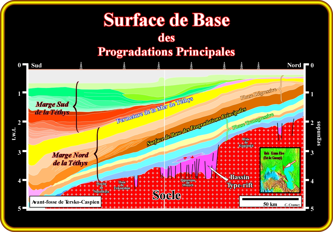 Cette tentative d'interprétation géologique d'une ligne sismique tirée dans une région tectoniquement active, illustre la fermeture de la Mer de Téthys. Dans la partie inférieure, on reconnaît la marge sud de l'Eurasia (marge nord de la Téthys) et, dans la partie supérieure, la marge nord du Gondwana. La surface de base des progradations principales (Cénomanien-Turonien), qui marque la surface d'inondation maximale du Crétacée (SIM 91.5 Ma), est clairement définie comme l'interface entre une géométrie rétrogradante (lignes chronostratigraphiques, plus au moins, parallèles de l'intervalle qui s'épaissit vers le continent) et une géométrie progradante (lignes chronostratigraphiques sigmoïdales, par fois obliques, de l'intervalle qui s'épaissit vers la mer) avec une polarité sud. La polarité ou vergence sud indique que le rebord continental et du bassin se déplacent vers le sud, ce qui suggère, un continent localisé au Nord (Eurasie) et un océan au Sud (mer de Téthys). Les roches-mères marines potentielles, autrement dit, les roches du Crétacée riches en matière organique (mature ou non) se sont déposées en association avec la surface d'inondation maximale (fossilisée par la surface de base des progradations principales), dont l'âge est Cénomanien-Turonien. La polarité des progradations et la surface de base des progradations de la marge nord du Gondwana, sus-jacente à la marge sud de l'Eurasie, suggèrent un continent au Sud (Gondwana) et un océan au Nord (Mer de Téthys). Avec le temps, au fur et à mesure que les continents Eurasie et Gondwana se sont approche l'un de l'autre, la Mer de Téthys est devenue de plus en plus petite. Finalement, La mer de Téthys s'est fermée complètement quand les deux marges (nord du Gondwana et sud de l'Eurasie) ont entrée en collision, ce qui est souligné par la surface de base des progradations, que dans ce cas particulier, correspond à une discordance majeure. Des roches-mère, probablement lacustres, se sont déposées sur la marge nord du Gondwana, qui aujourd'hui forme une part des montagnes du Caucase.