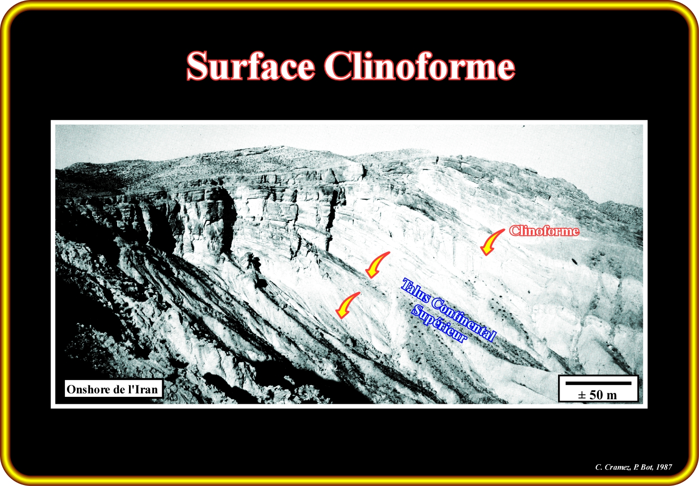 Dans cette photo, les surfaces clinoformes sont facilement reconnues par leur géométrie sigmoïdale. En fait,on peut dire, que ces surfaces sont, généralement, constituées par deux ou trois segments : (i) Un segment incliné, avec vergence vers la mer, qui correspond, presque toujours, à un talus continental ; (ii) Un segment horizontal ou sub-horizontal (au moment du dépôt) en amont du segment incliné et (iii) Une segment horizontal ou sub-horizontal en aval du segment incliné. Il est important de ne pas oublier que le ou les segments horizontaux, par fois, ne sont pas présents. Dans une surface clinoforme sigmoïdale, autrement dit, composée par les trois segments, le segment incliné vers la mer lie des environnements sédimentaires d'eau peu profonde (sédiments de plate-forme) avec des environnements profonds de plaine abyssale. Le segment incliné vers l'aval souligne toujours, ou presque toujours, le talus continental. Aucun géoscientiste, qui connaît les rudiments de la stratigraphie séquentielle, utilise l'expression surface clinoforme pour désigner les surfaces de dépôts inclinées du cortège transgressifs, bien qu'une transgression soit, simplement, une superposition, plus au moins, aggradante, de régressions dont les amplitudes sont chaque fois plus petites. Ces surfaces inclinées correspondent, en général, à des talus deltaïques, dont l'amplitude dépasse rarement les 50 mètres, ce qui n'est pas le cas des talus continentaux, dont l'amplitude est toujours supérieure à 200 mètres (n'oublions pas qu'un interprétation géologique est dépendante de l'échelle). L'apport sédimentaire est toujours continental. Les clastiques, qui forment une transgression progradent du continent vers la mer, une fois qu'il n'y a pas clastiques que viennent directement du large (près de la côte des clastique peuvent être transportés par des courants littoraux).