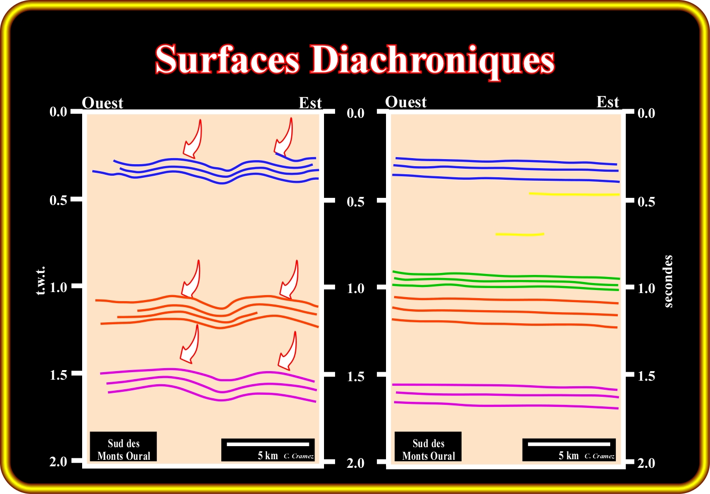 Théoriquement, dans le Phanérozoïque, il y a deux surfaces de base des progradations principales, une fois qu'il s'est déposé en association avec deux cycles eustatiques de 1er ordre. La première est associée avec le pic eustatique paléozoïque (plus au moins entre le Cambrien et le Silurien, fonction des géoscientistes), la deuxième avec le pic eustatique du Méso-Cénozoïque (SBPP. 91.5 Ma). Les surfaces de base des progradations secondaires sont associées avec des cycles eustatiques inférieurs (2e, 3e et 4-5e ordre). Dans ces tentatives d'interprétation géologique d'une ligne sismique régional de la Mer du Nord, les résultats stratigraphiques et paléontologiques des puits d'exploration pétrolière suggèrent que les âges, plus probables, des discordances, qui définissent les différents paquets sédimentaires sont : SB. 21 Ma, SB. 30 Ma, SB. 36 Ma, SB 39.5 Ma (?), SB. 49.5 Ma et SB 55 Ma. Les surfaces d'érosion qui soulignent ces discordances ont été induites par des cycles eustatiques de 2e ordre (durée entre 3-5 My et 50 My). Les intervalles considérées ne correspondent pas à des cycles-séquence. Dans ces paquets sédimentaires, on reconnaît des épisodes transgressifs et régressifs. Dans la tentative d'interprétation de la gauche, uniquement les lignes chronostratigraphiques plus évidentes ont été pointées. À droite, est schématisée une tentative d'interprétation séquentielle en sous-cycles d'empiétement continental. Les intervalles colorés en violet représentent les intervalles sédimentaires déposés en des condition géologiques de n^bas niveau marin (niveau de la mer plus bas que le rebord du bassin). Les intervalles colorés en vert (il y a deux tonalités) représentent les intervalles sédimentaires transgressifs et régressifs déposés pendant que les conditions géologiques étaient de haut niveau de la mer. Les surfaces de base des progradations secondaires sont facilement reconnues entre les intervalles transgressifs et régressifs. Des roches-mères potentielles secondaires (marines) se trouvent, par fois, associées avec ces surfaces de base des progradations, qui sont induites par des cycles eustatiques de 2e ordre.